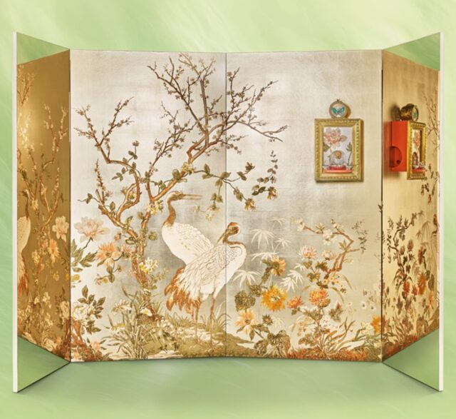 Les motifs en feuille d’or blanc et de cerisier asiatique, sur le bois de Coromandel, rappelent les grues élégantes du papier peint de George Sand.