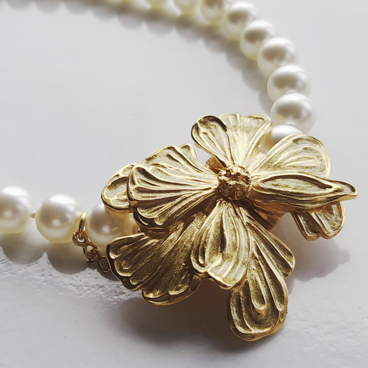 Elle travaille ainsi, avec des perles nacrées grâce à un procédé unique de nacrage sur noyau en pâte de verre assurant une parfaite ressemblance aux perles de culture. Montées sur un fil de soie, fait d’entrenoeuds, il assure à la fois un tombé parfait et, en cas de casse, il pourra être remonté à vie sans perdre ses perles. Les différentes pièces sont également dorées à la main, à l’or 24 carats, pour garantir leur durabilité.