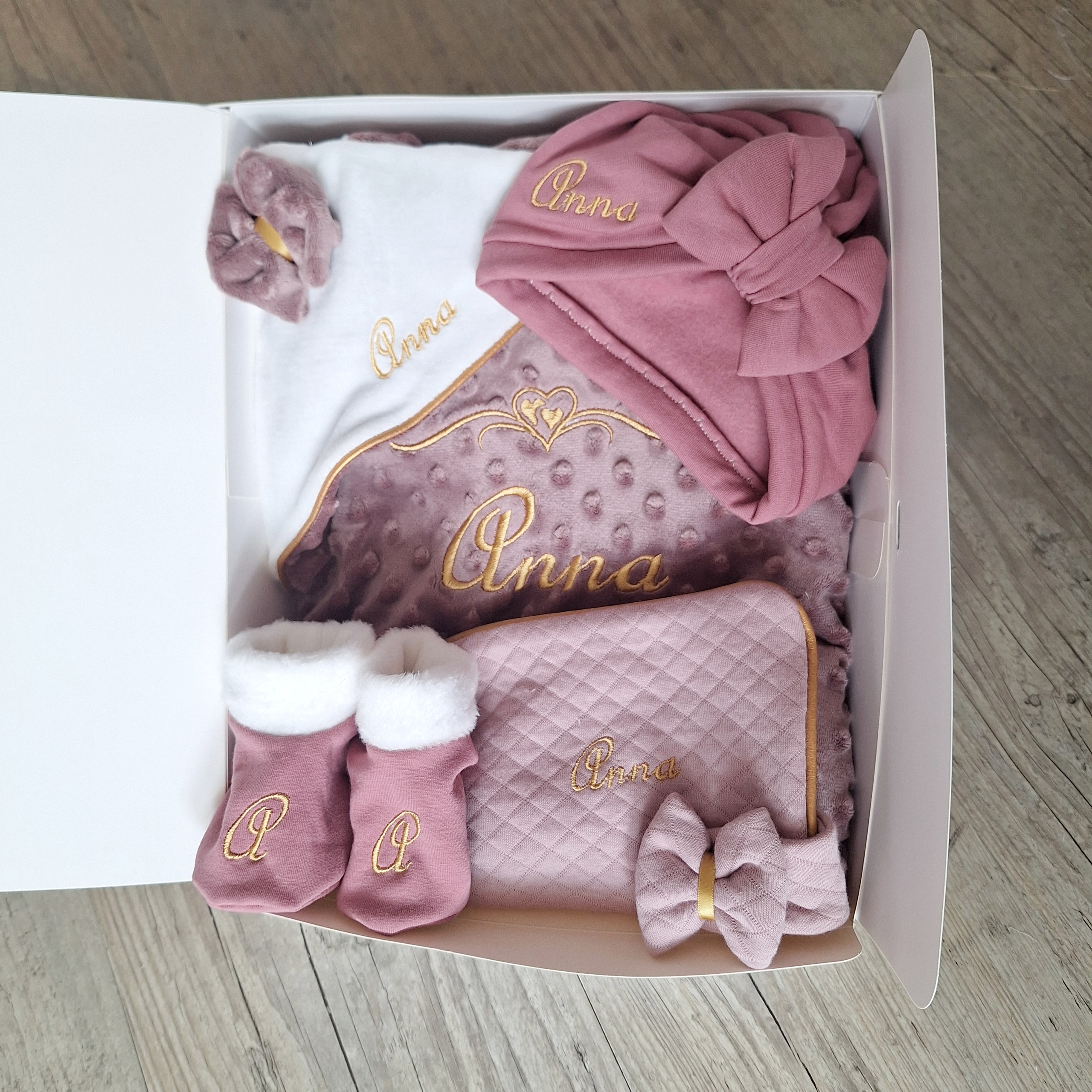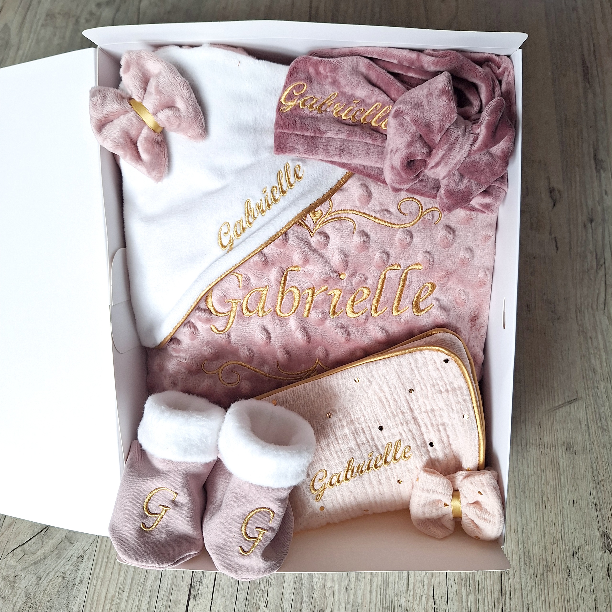 Le coffret de naissance composé : d’une couverture, d’un bonnet ou d’un turban, des chaussons, d’un doudou et d’un protège carnet de santé.