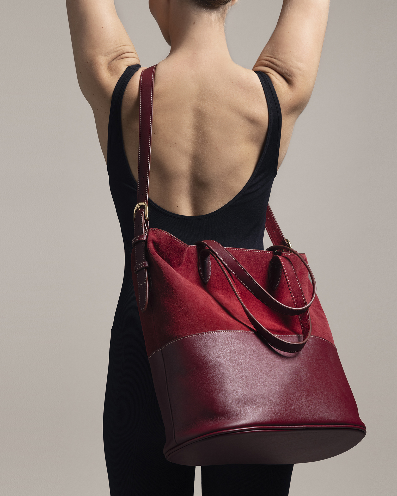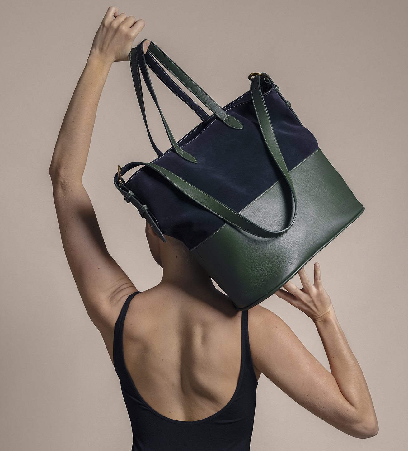 Nécessitant plus de 18 heures de travail manuel, les sacs Olympe se porte à la main, à l’épaule ou en bandoulière.