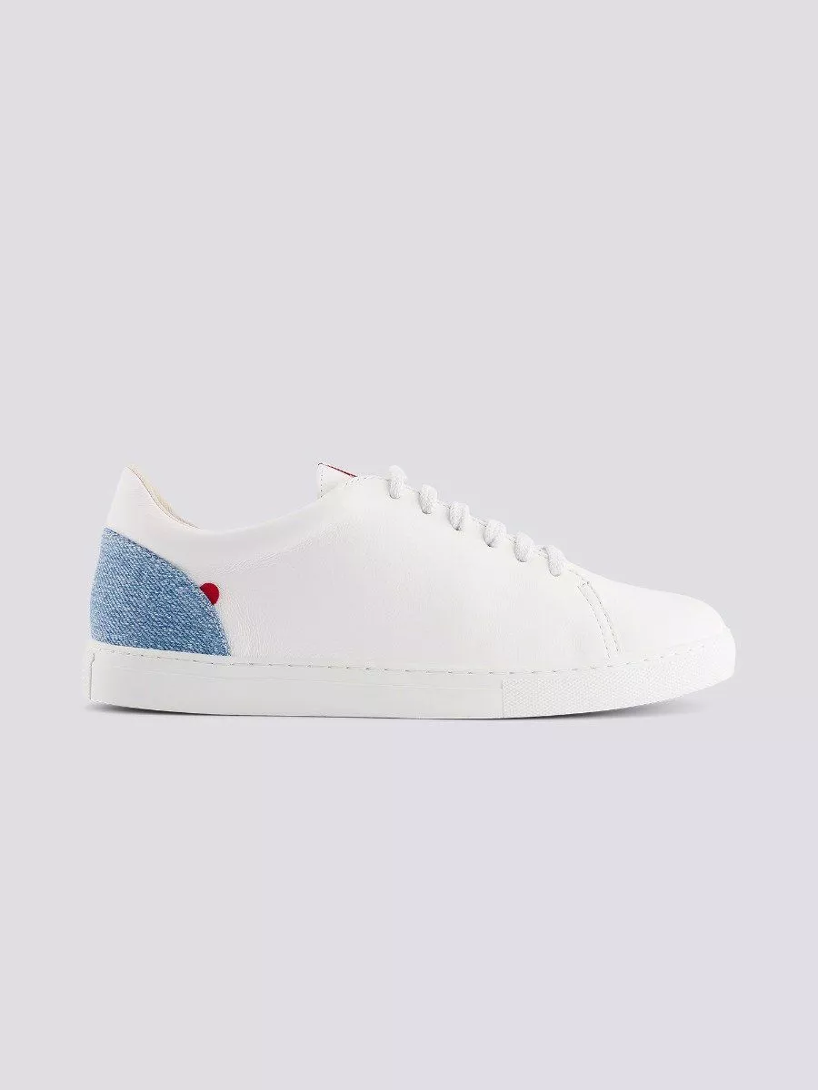 SNEAKERS AVEC DU JEANS DELAVÉ L'iconique 912, la paire de sneakers blanches en cuir ! Dans cette version, la couleur du talon se décline en bleu délavé, un coloris obtenu grâce à un procédé de délavage à l’ozone local et écoresponsable, très peu consommateur d’eau. Fabriquées en France du dessin jusqu’au montage, nos 912 sont conçues pour être aussi confortables que résistantes, de leur doublure en coton jusqu'à leurs lacets en lin.