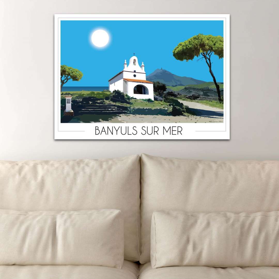 Affiche Banyuls sur Mer – Une illustration douce et apaisante de la chapelle de Salette, perchée au-dessus des vignes et du village. Signée Marie Troff, imprimée en France, cette affiche évoque la beauté tranquille de la Côte Vermeille.
