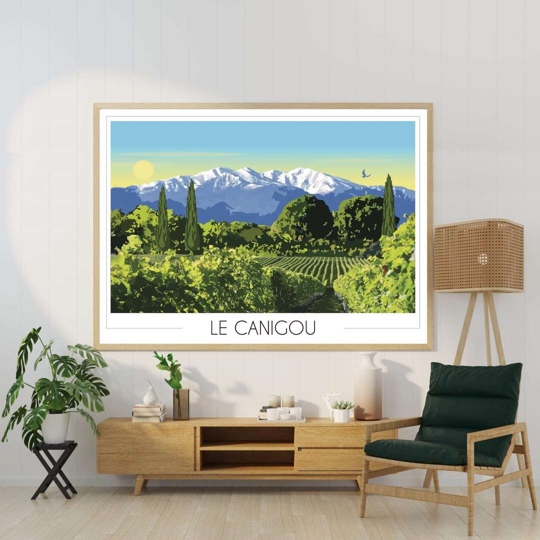 Affiche Canigou enneigé : un poster montagne qui montre le Mont Canigó depuis la plaine d’Occitanie.