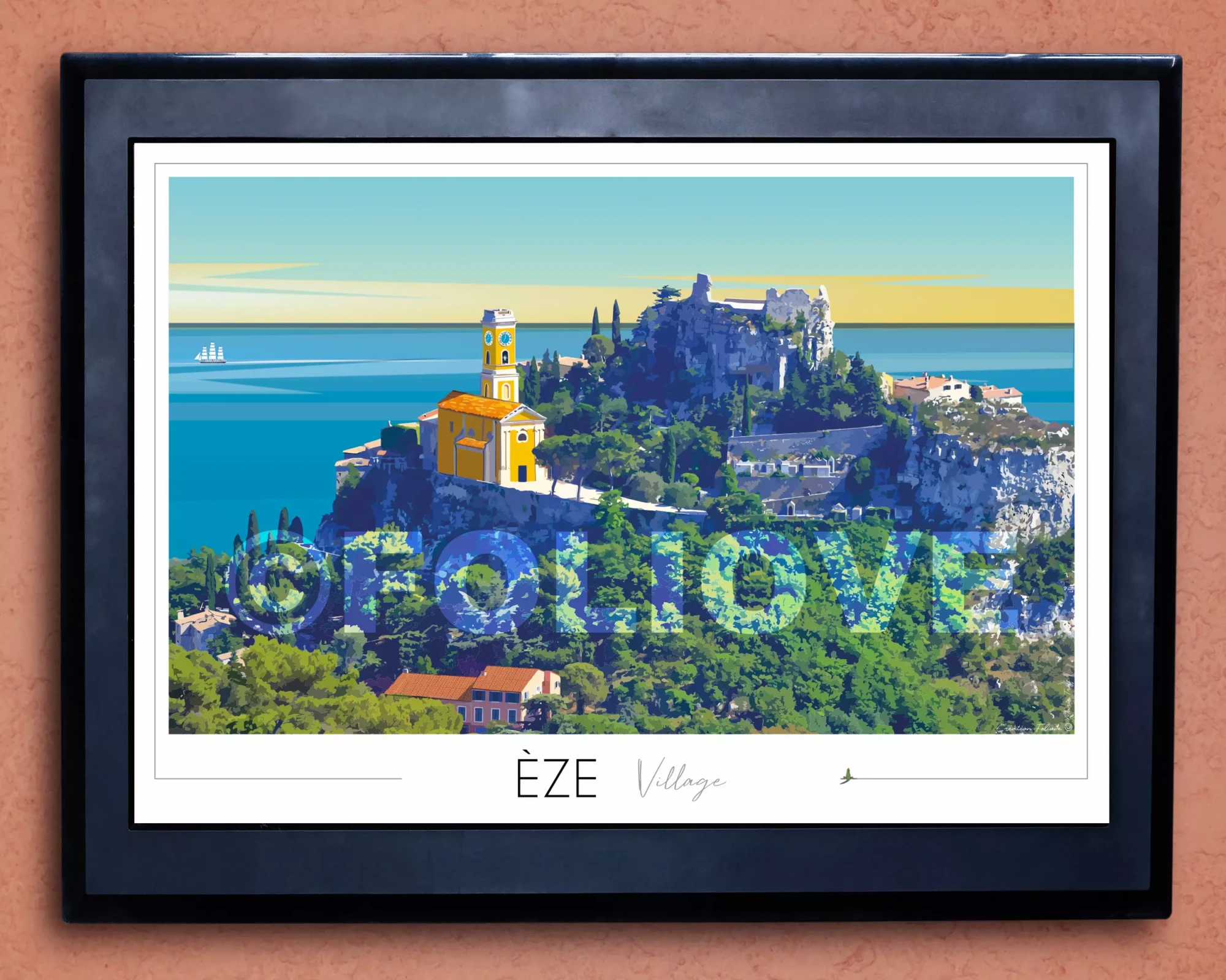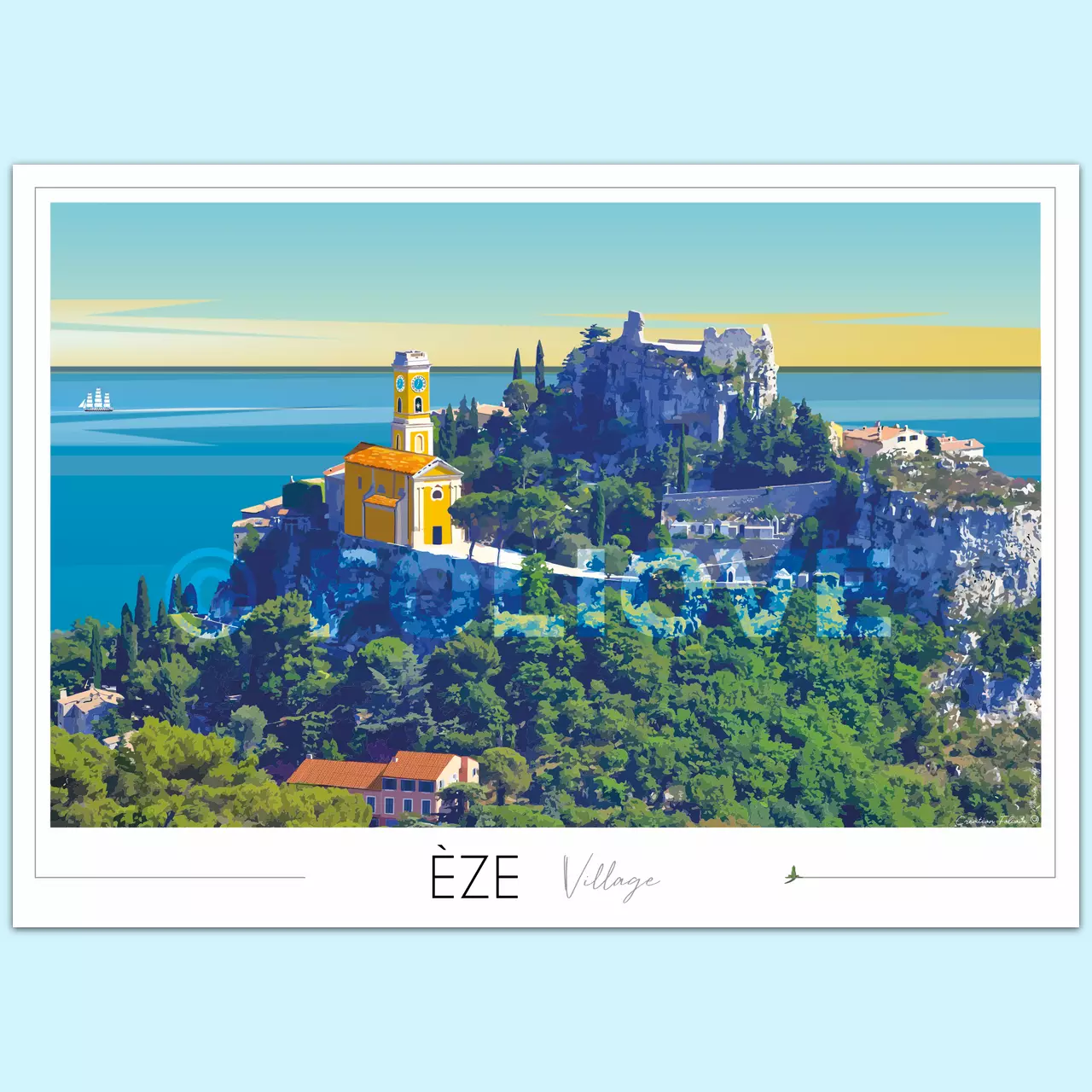 Affiche Èze village – Une illustration douce et ensoleillée du village perché d’Èze. Pierres anciennes, ruelles fleuries et ambiance méditerranéenne. Signée Marie Troff, imprimée en France.