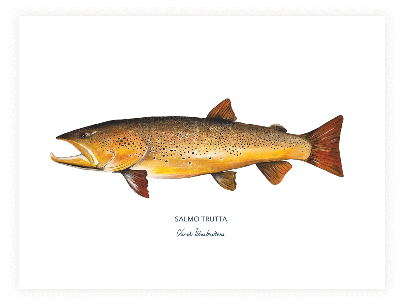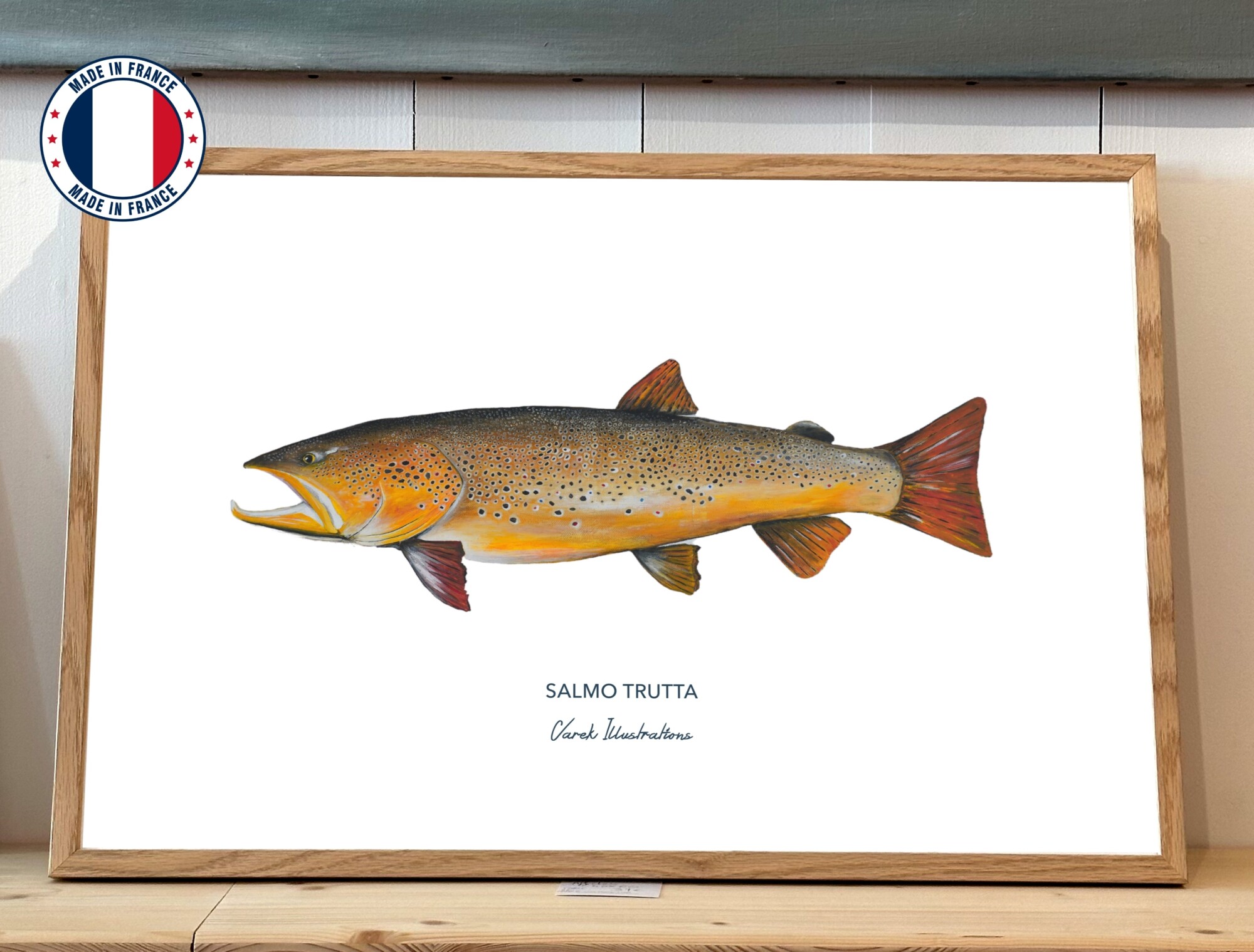 Peinture Originale faite à l'acrylique sur une toile en coton. Impression en France Les affiches sont imprimées en France sur un papier d'art Bio Top, éco-responsable de 250 gr. Un papier blanc offset de qualité supérieure, naturel et produit sans chlore et sans azurants optique. Les Caractéristiques Format : 50 x 70 cm ou 40 cm x 60 cm ou 30 x 40 cm Impression quadri recto Papier Biotop naturel 250 gr ️ Le Cadre Bois de chêne de qualité supérieure Vitre en plexi incassable Coupé puis fabriqué en Europe Issu d'une production responsable Accroche horizontale en métal Le Transport Sans cadre, les affiches sont envoyées roulées dans des tubes de protection en carton et protégées d'un papier de soie. Encadrée, l'affiche est emballée dans un papier bulle protecteur puis envoyée dans un carton rectangulaire de protection. Un petit mot sur le poisson La Truite Fario est un des salmonidés les plus prisés par les pêcheurs à la mouche des rivières du globe. Selon son habitat, sa taille ou encore la saison elle va présenter des couleurs et une robe tout à fait différentes, allant du jaune or au orange vif. De quoi ravir le peintre qui sommeille en chacun de nous...