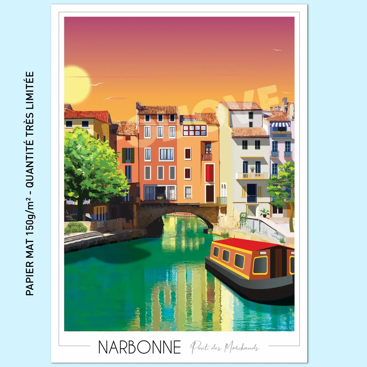 Foliove Affiche Narbonne – Pont des Marchands (édition imparfaite). Imprimée sur papier 150g mat au lieu du 170g couché demi-mat. Une différence de texture, pas de beauté. Une fois encadrée, l’illustration reste éclatante. Chez Foliove, rien ne se perd : ces tirages hors standard méritent aussi leur place sur vos murs.