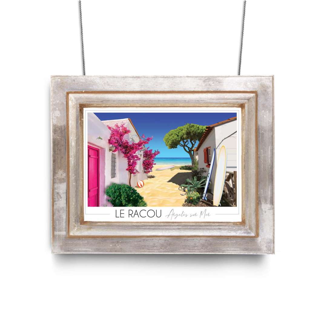 Affiche Plage du Racou, Argelès-sur-Mer : une parenthèse douce, entre sable clair, eau calme et ambiance de hameau marin. Le Racou garde ce charme un peu secret, loin du bruit. Marie Troff signe une illustration originale, en exclusivité pour Foliove. Foliove imprime localement en France dans le réseau Imprim’Vert.
