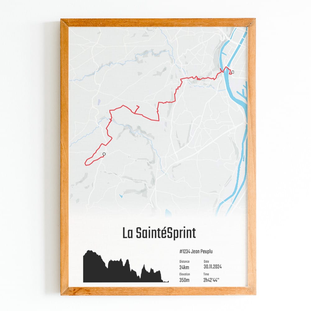 Cette affiche du parcours de la SaintéSprint est imprimée sur du papier brillant haute qualité.Pour créer un poster personnel et unique, ajoutez votre nom, votre numéro de dossard et votre temps d'arrivée.