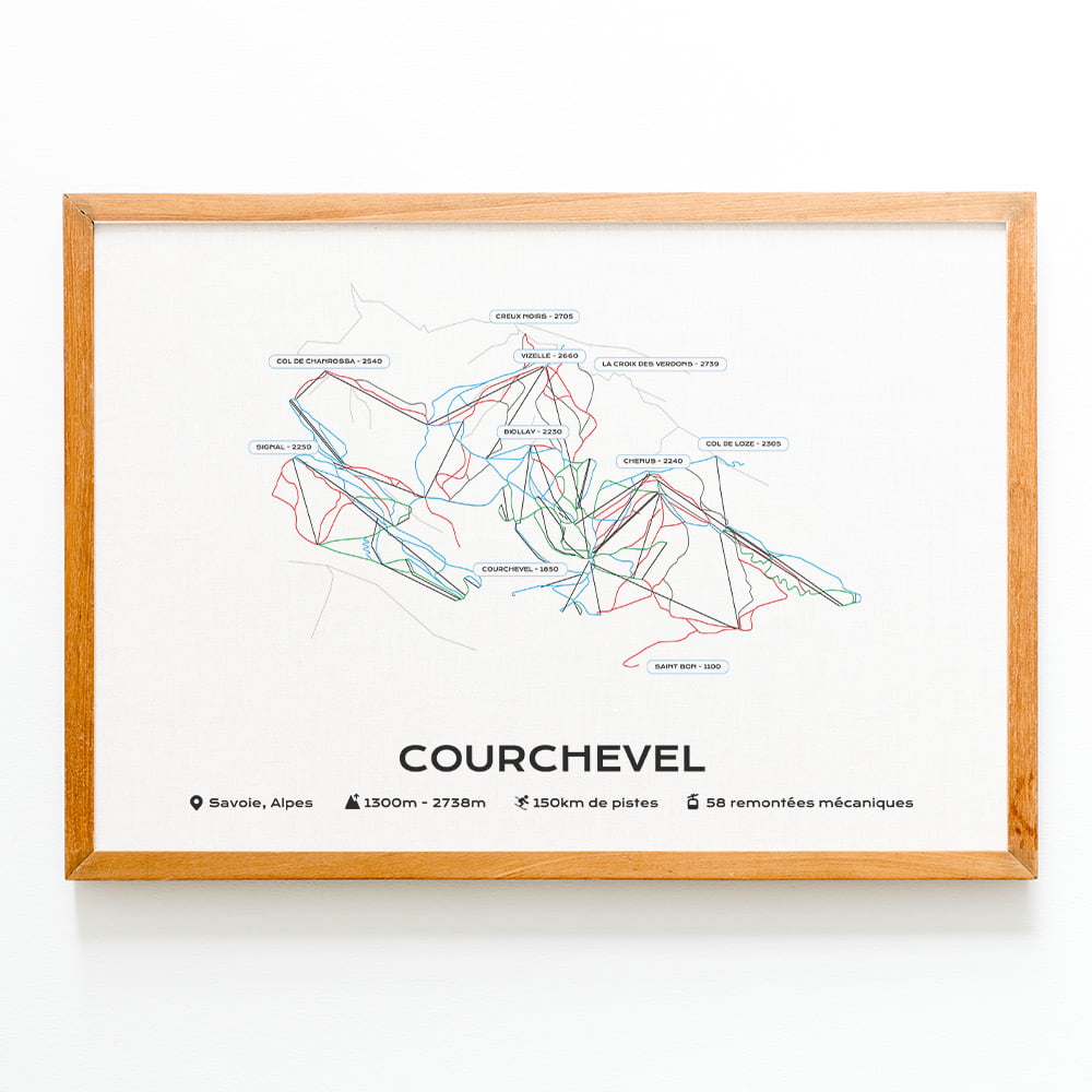 Cette affiche du plan des pistes du domaine skiable de la station de Courchevel est imprimée sur du papier brillant haute qualité.Pour créer un poster personnel et unique, vous pouvez le faire dans les champs de texte disponibles.