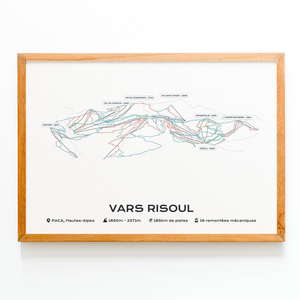 Cette affiche du plan des pistes du domaine skiable de la station de Vars Risoul est imprimée sur du papier brillant haute qualité.Pour créer un poster personnel et unique, vous pouvez le faire dans les champs de texte disponibles.