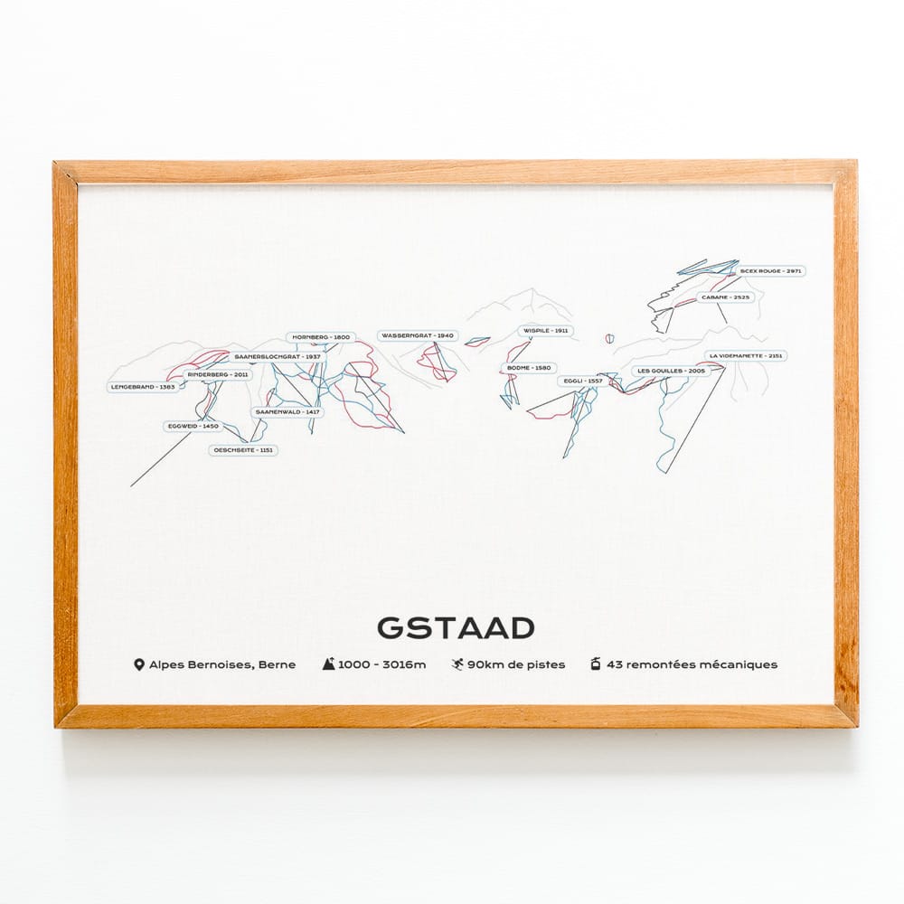 Cette affiche du plan des pistes du domaine skiable de la station de Gstaad est imprimée sur du papier brillant haute qualité.Pour créer un poster personnel et unique, vous pouvez le faire dans les champs de texte disponibles.