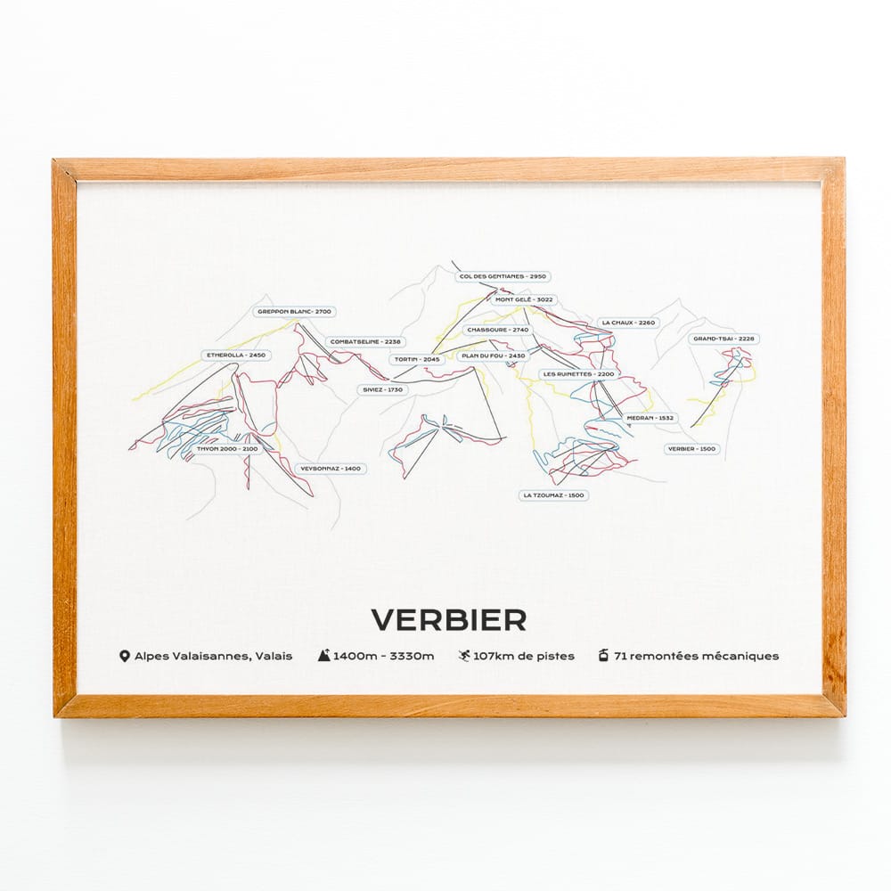 Cette affiche du plan des pistes du domaine skiable de la station de Verbier est imprimée sur du papier brillant haute qualité.Pour créer un poster personnel et unique, vous pouvez le faire dans les champs de texte disponibles.