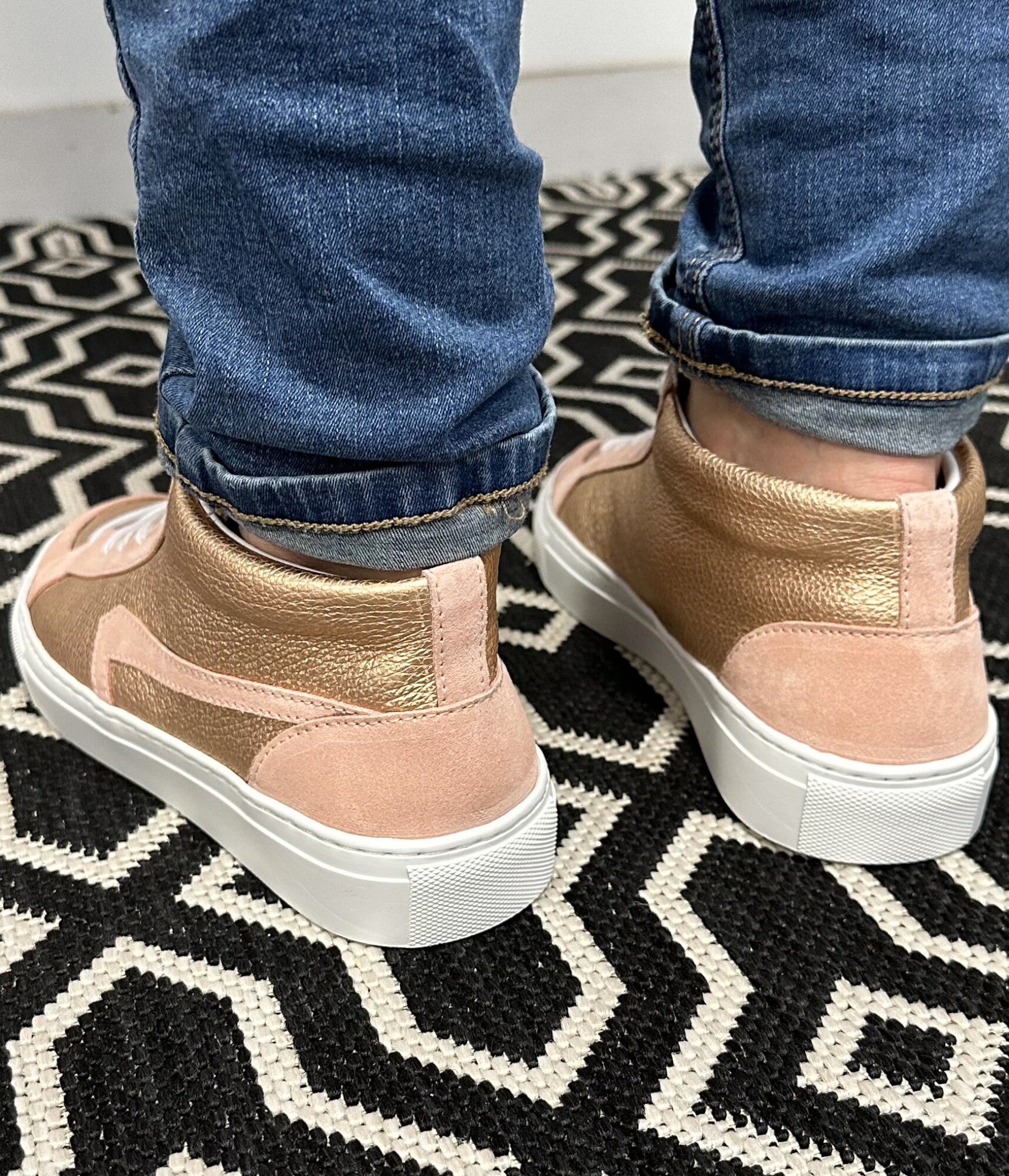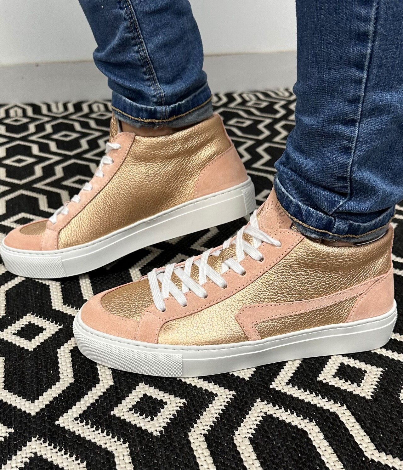 Nous vous proposons notre basket BELLEGARDE avec cette version utilisant notre cuir Métallisé Or Rose accompagné du Velours Rose. Cette version en série limitée utilise des cuirs "upcyclés" comme l'ensemble de notre fabrication.