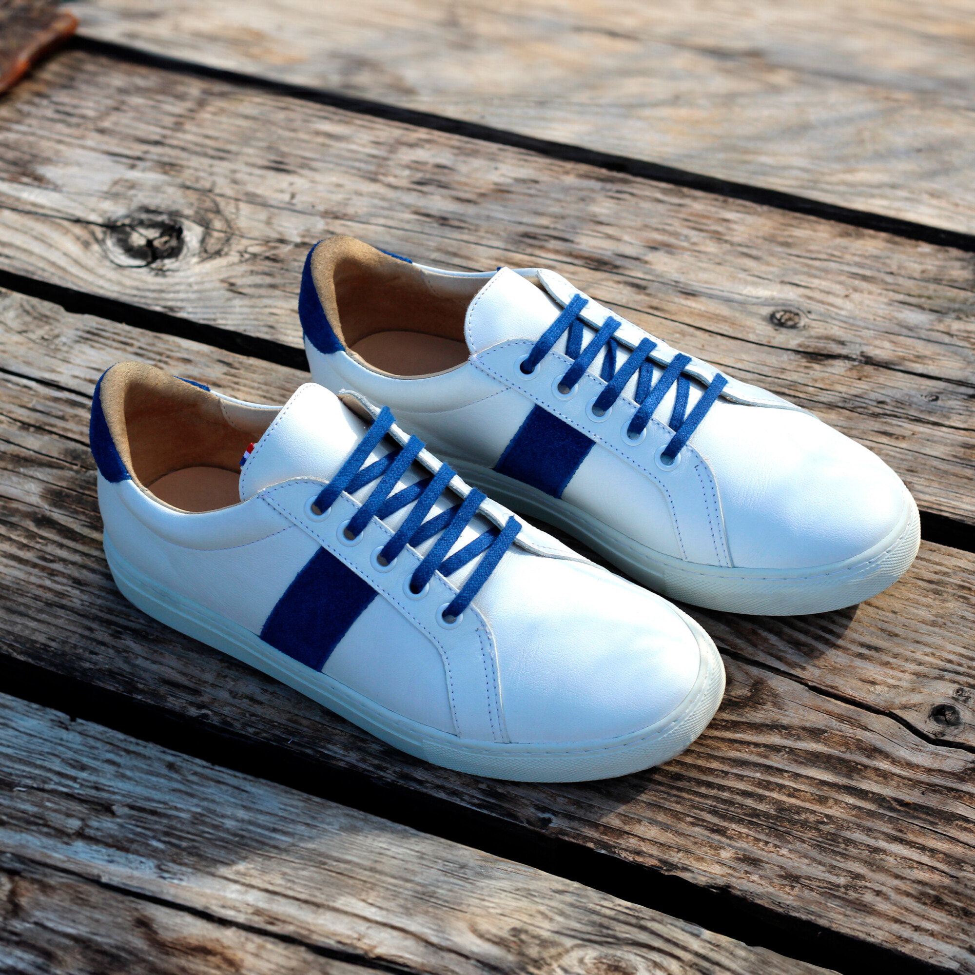 Baskets Made in France en cuir blanc et bleu, fabriquées en France dans notre atelier partenaire à Cholet, au cœur du bassin historique de la chaussure. Aussi appelées sneakers françaises ou baskets cuir fabriquées en France, ces baskets perpétuent un savoir-faire local précieux. Cuir européen d'origine Italie, doublure cuir lisse sans chrome. Cuir blanc et bleu. Lacets coordonnés. Œillets ronds vieil or. Étiquette tissée tricolore sur la languette, signature Made in France. Semelle intérieure amovible. Semelle extérieure gomme légère avec motif antidérapant, épaisseur 2,5 cm. 100 % fabriquées en France, certifiées Origine France Garantie. Cuir de veau d'origine Italie. Emballage certifié FSC et PEFC, réemployable et recyclable. Pour ce modèle, prenez votre pointure habituelle. Si vous êtes entre 2 pointures, prenez la pointure inférieure. Nettoyez avec un chiffon doux, appliquez une crème pour nourrir le cuir et un cirage pour protéger la couleur.