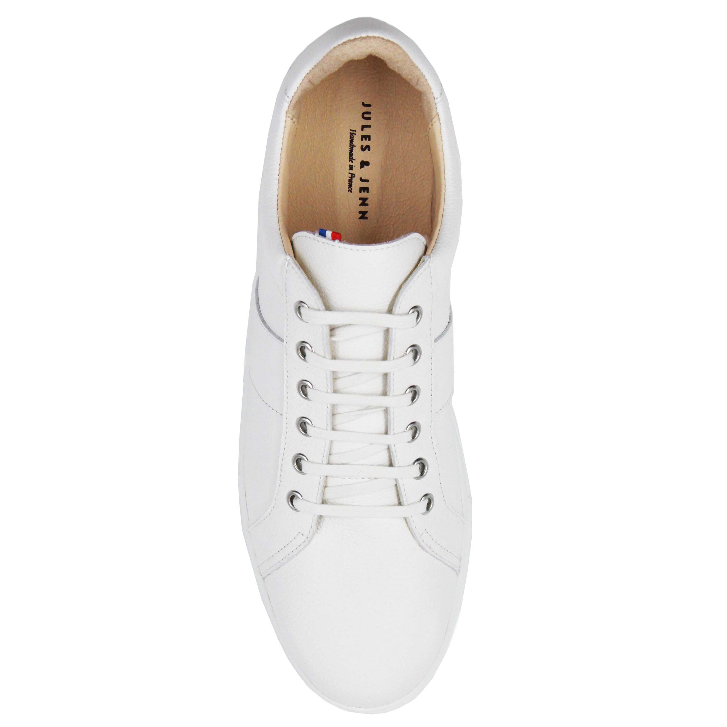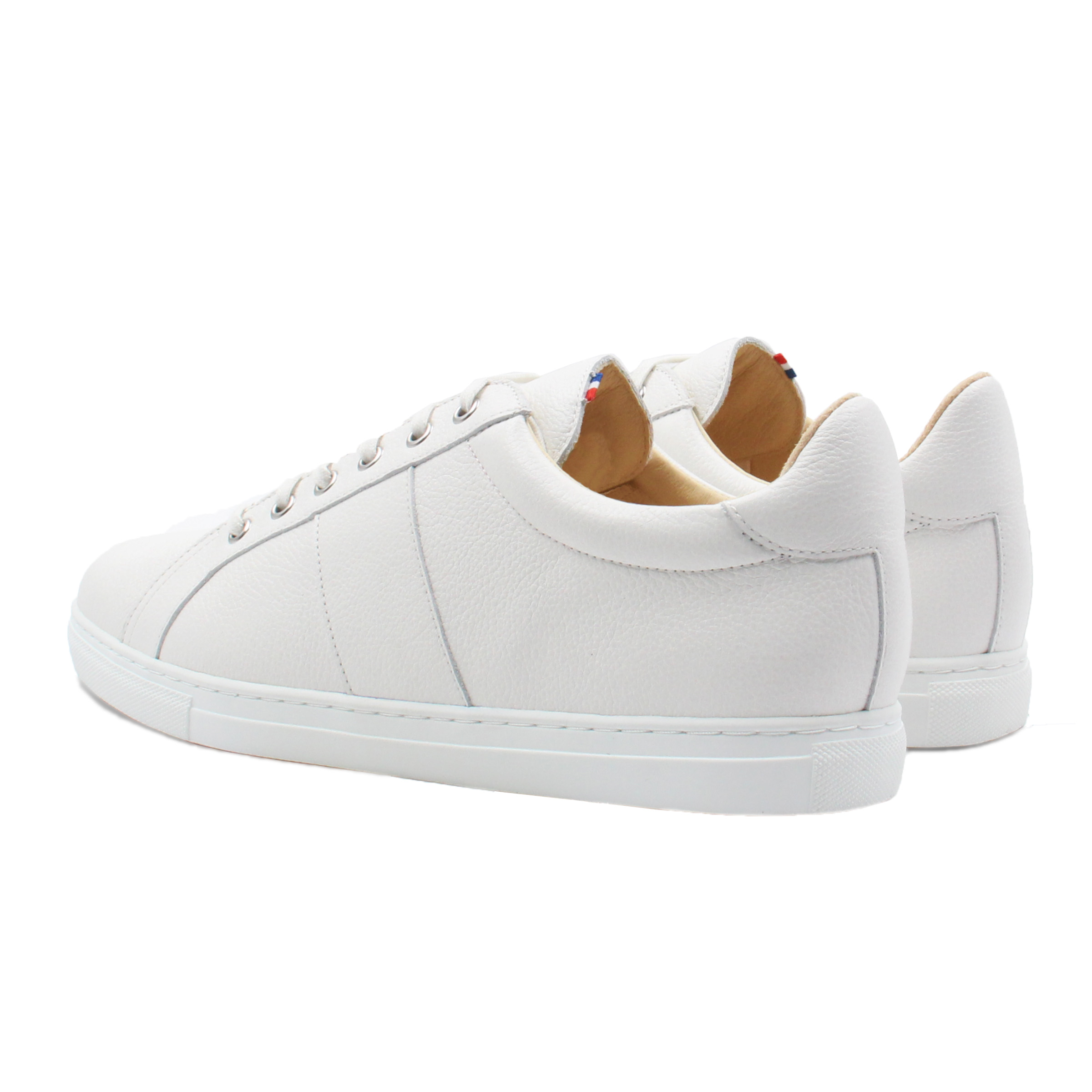 Baskets Made in France en cuir grainé blanc, fabriquées en France dans notre atelier partenaire à Cholet, au cœur du bassin historique de la chaussure. Aussi appelées sneakers françaises ou baskets cuir fabriquées en France, ces baskets perpétuent un savoir-faire local précieux. Cuir européen d'origine Italie, doublure cuir lisse sans chrome. Cuir grainé blanc. Lacets coordonnés. Œillets ronds vieil or. Étiquette tissée tricolore sur la languette, signature Made in France. Semelle intérieure amovible. Semelle extérieure gomme légère avec motif antidérapant, épaisseur 2,5 cm. 100 % fabriquées en France, certifiées Origine France Garantie. Cuir de veau d'origine Italie. Emballage certifié FSC et PEFC, réemployable et recyclable. Pour ce modèle, prenez votre pointure habituelle. Si vous êtes entre 2 pointures, prenez la pointure inférieure. Le cuir grainé se nettoie avec un chiffon doux, appliquez une crème pour nourrir la matière et un cirage pour protéger la couleur.