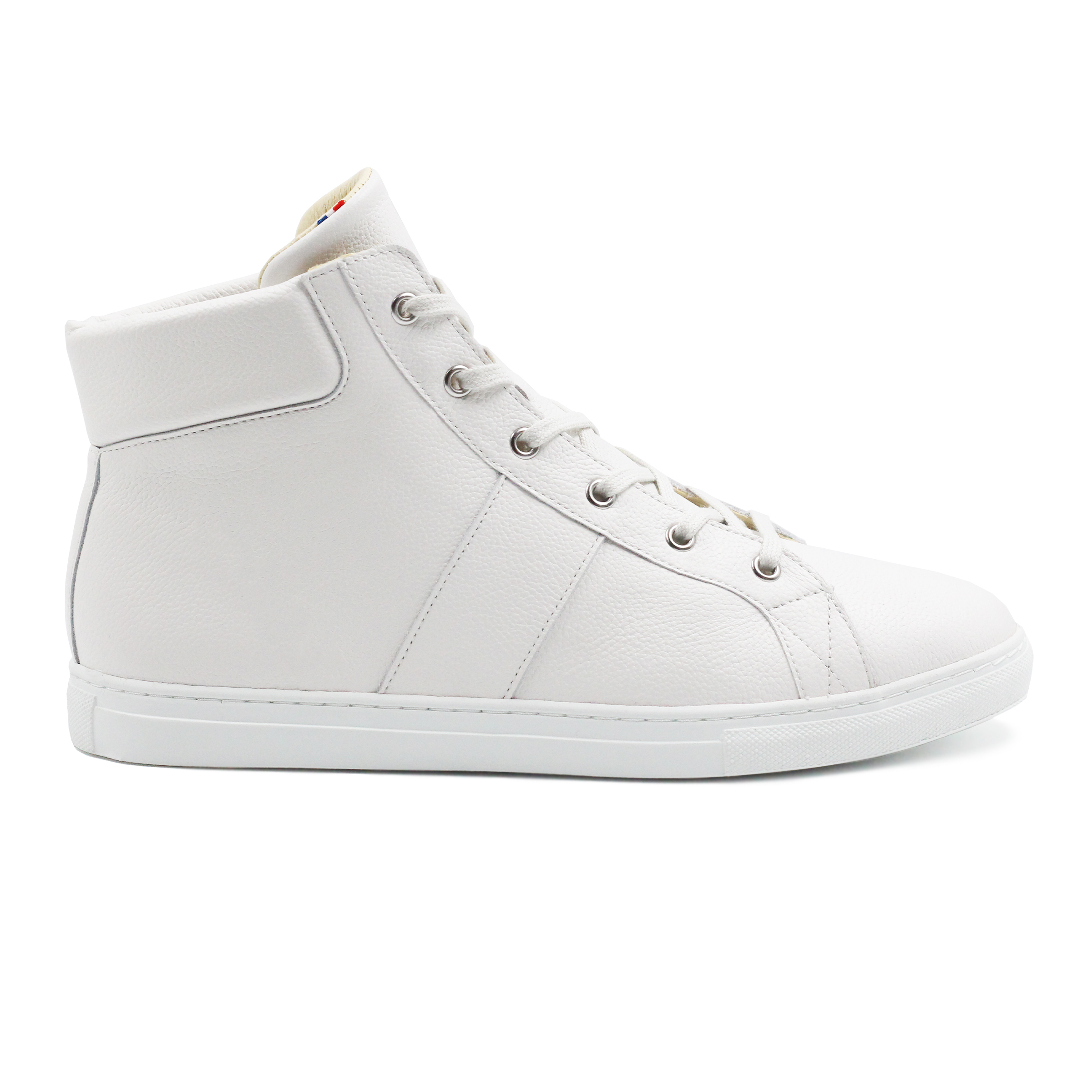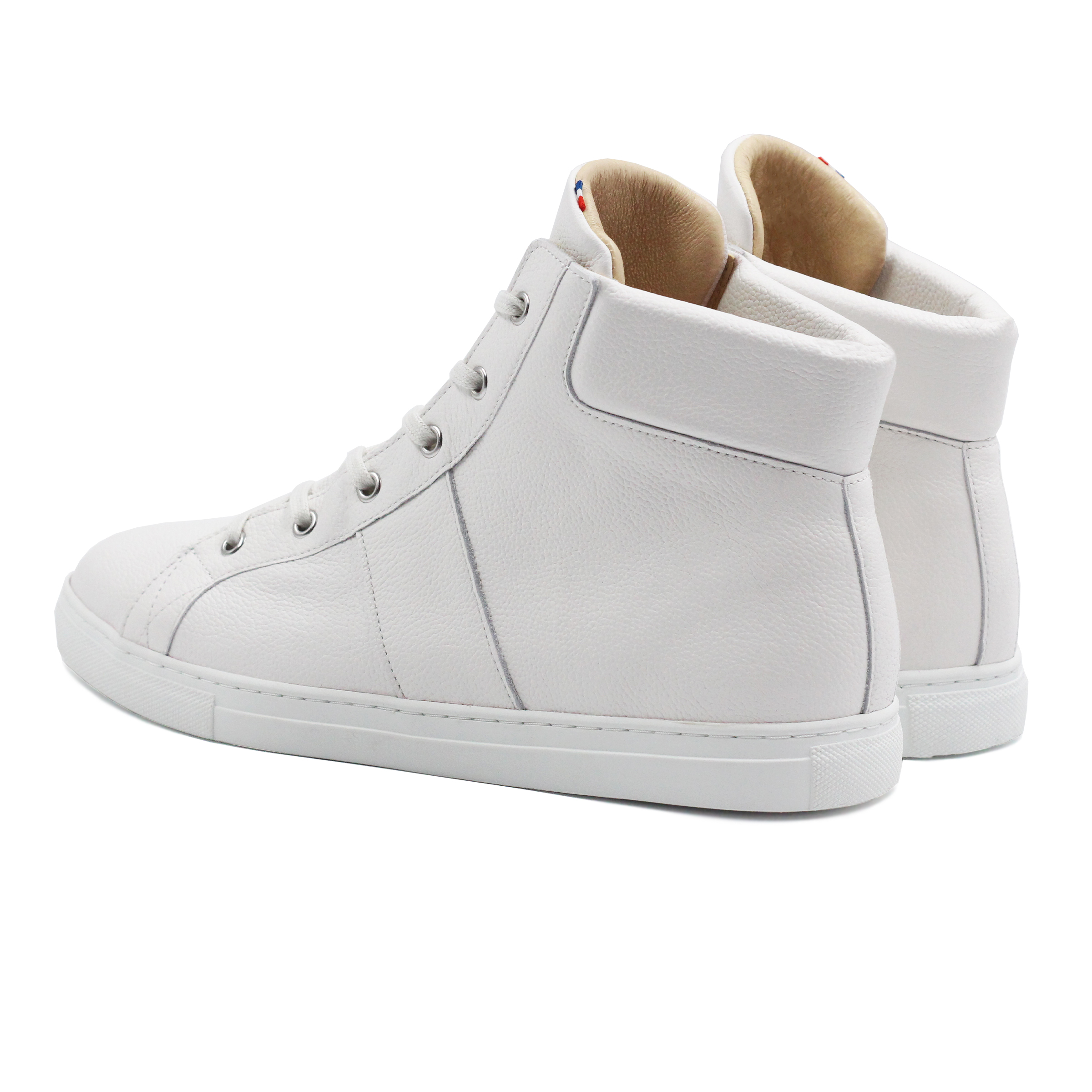 La basket montante JULES & JENN a été confectionnée près de chez vous ! Fabriquée en France, elle est conçue dans un cuir grainé blanc italien de grande qualité. D’un style résolument vintage, elle apporte un confort inégalable tout au long de la journée grâce à son increvable semelle légère en caoutchouc. Son discret clin d'œil ? L’étiquette tricolore cousue sur la languette ! Hauteur de la basket depuis le talon : 13 cm