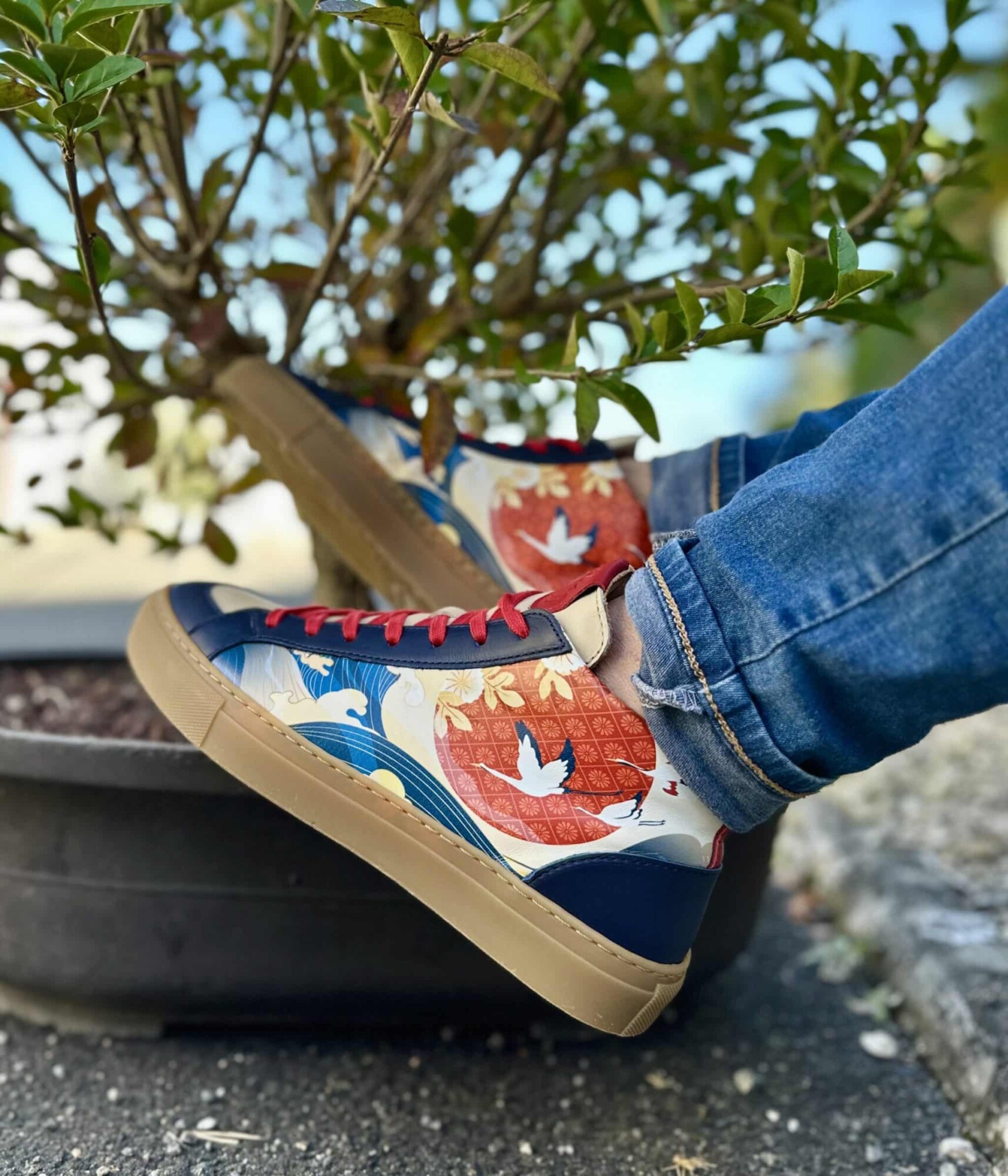 Bellegarde : une basket française Nous vous proposons notre modèle BELLEGARDE avec cette version "japonnisante" utilisant notre motif ASRA agrémentée de cuir de coloris Marine et Beige. Cette version en série limitée utilise des cuirs "upcyclés" comme l'ensemble de notre fabrication. Pour rappel, l'ensemble de nos baskets sont fabriquées entièrement en France dans notre atelier Limousin.