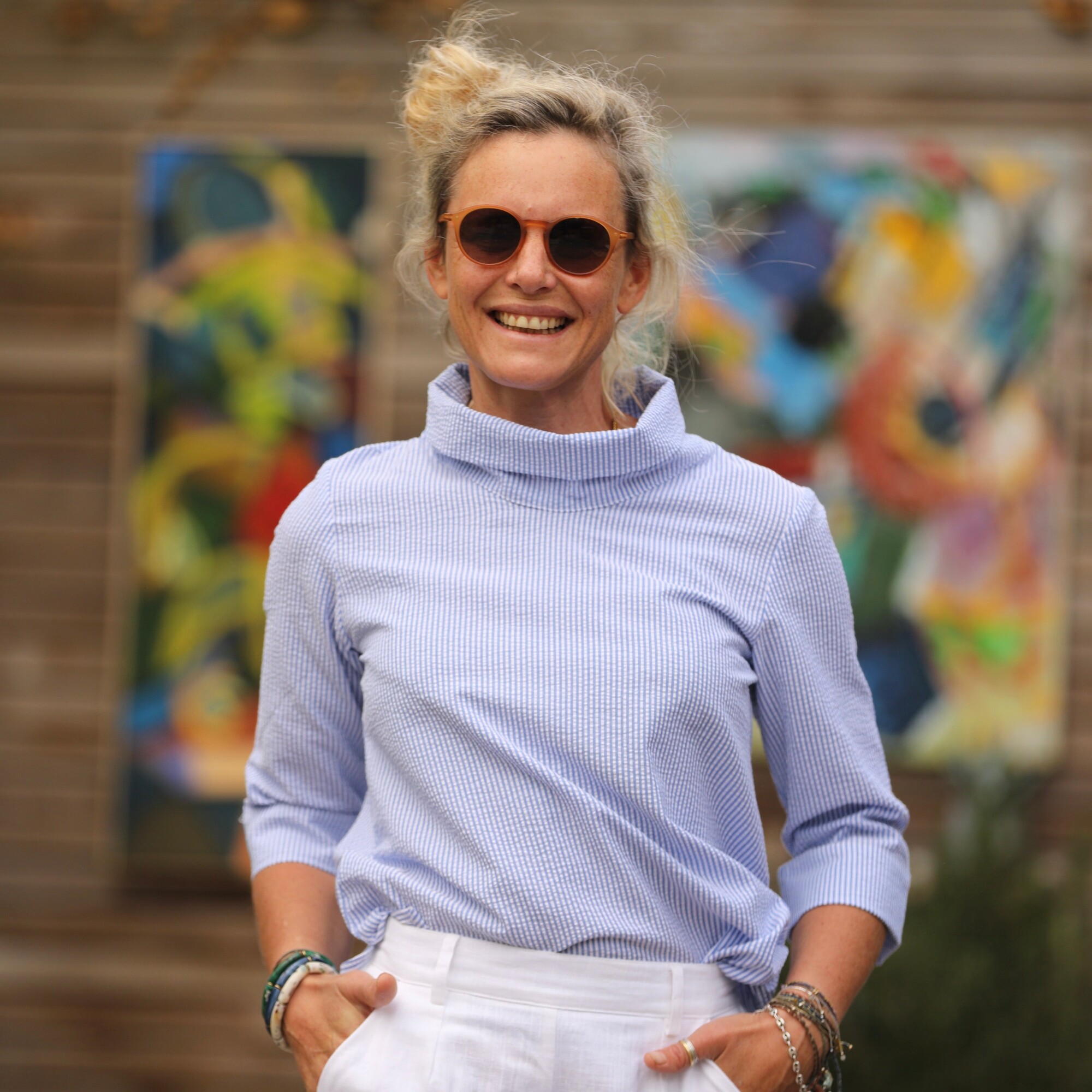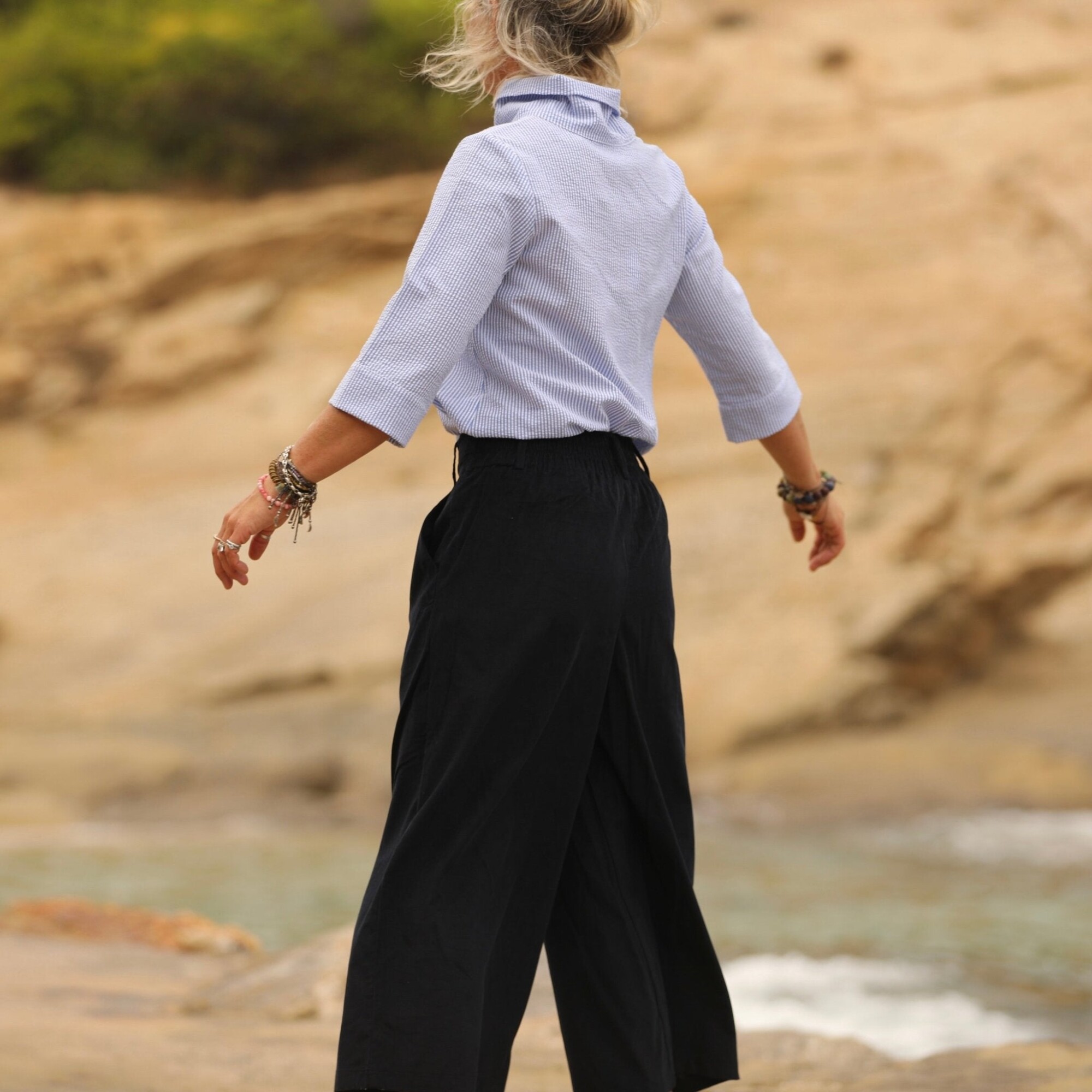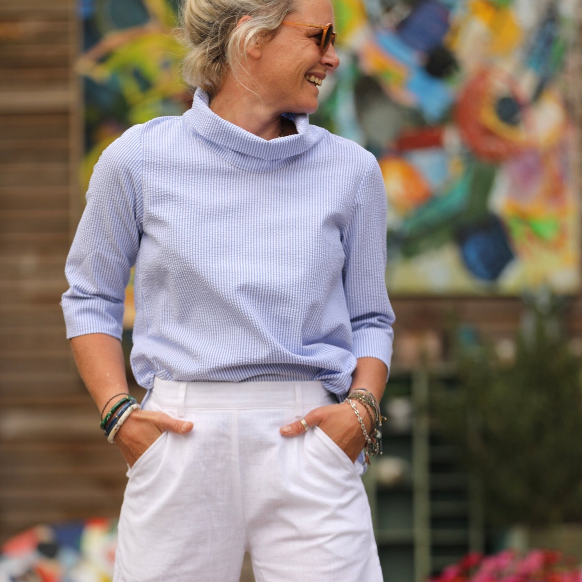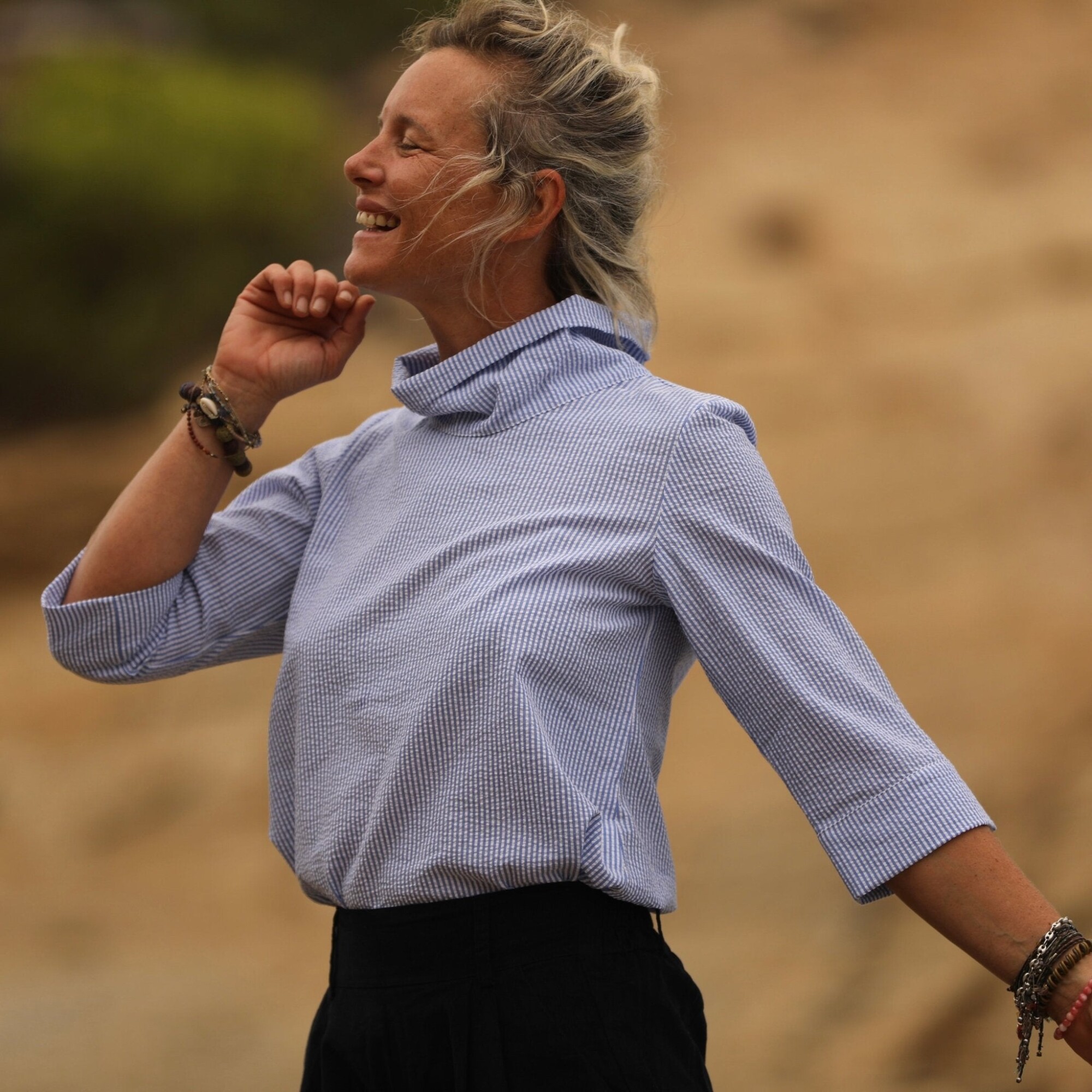 Catherine est une blouse au col montant dégagé, offrant une élégance subtile. Ses épaules légèrement froncées ajoutent une touche de délicatesse, tandis que sa coupe ample aux hanches, agrémentée d’ouvertures de chaque côté, crée un effet tunique harmonieux.