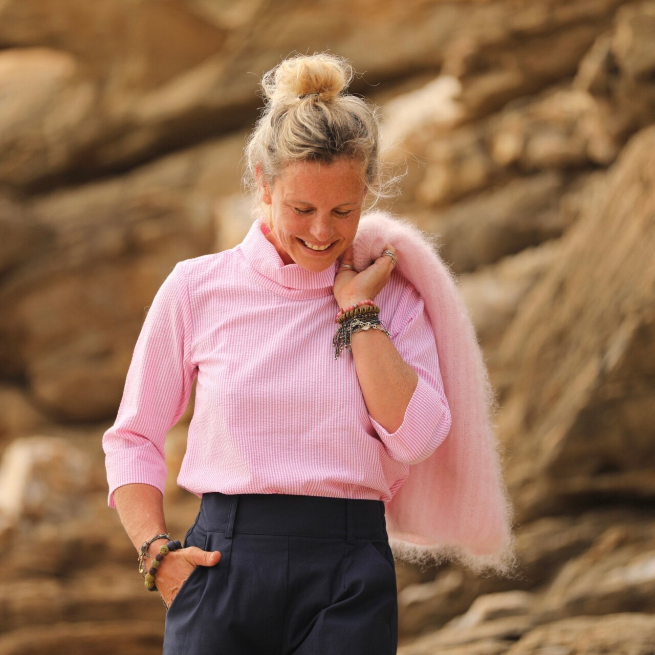 Catherine est une blouse au col montant dégagé, offrant une élégance subtile. Ses épaules légèrement froncées ajoutent une touche de délicatesse, tandis que sa coupe ample aux hanches, agrémentée d’ouvertures de chaque côté, crée un effet tunique harmonieux.