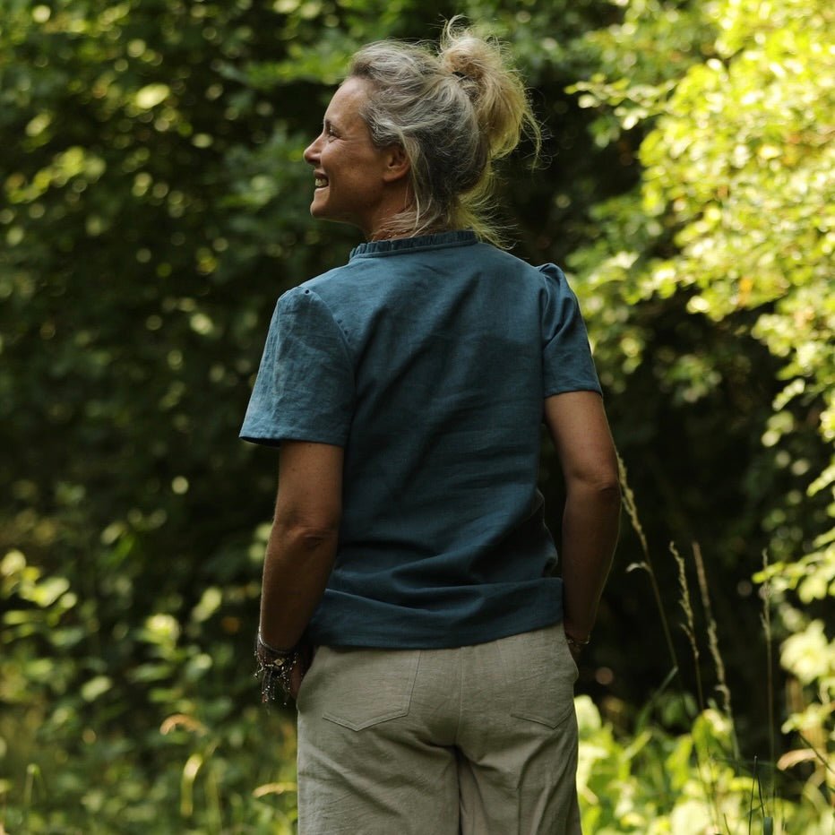 Ernestine est une blouse élégante au col froufrou subtil et à l’encolure en V délicate, façonnée en forme de goutte d’eau. Ses manches, d’une longueur équilibrée, sont agrémentées de fronces à l’épaule pour allier confort et élégance.