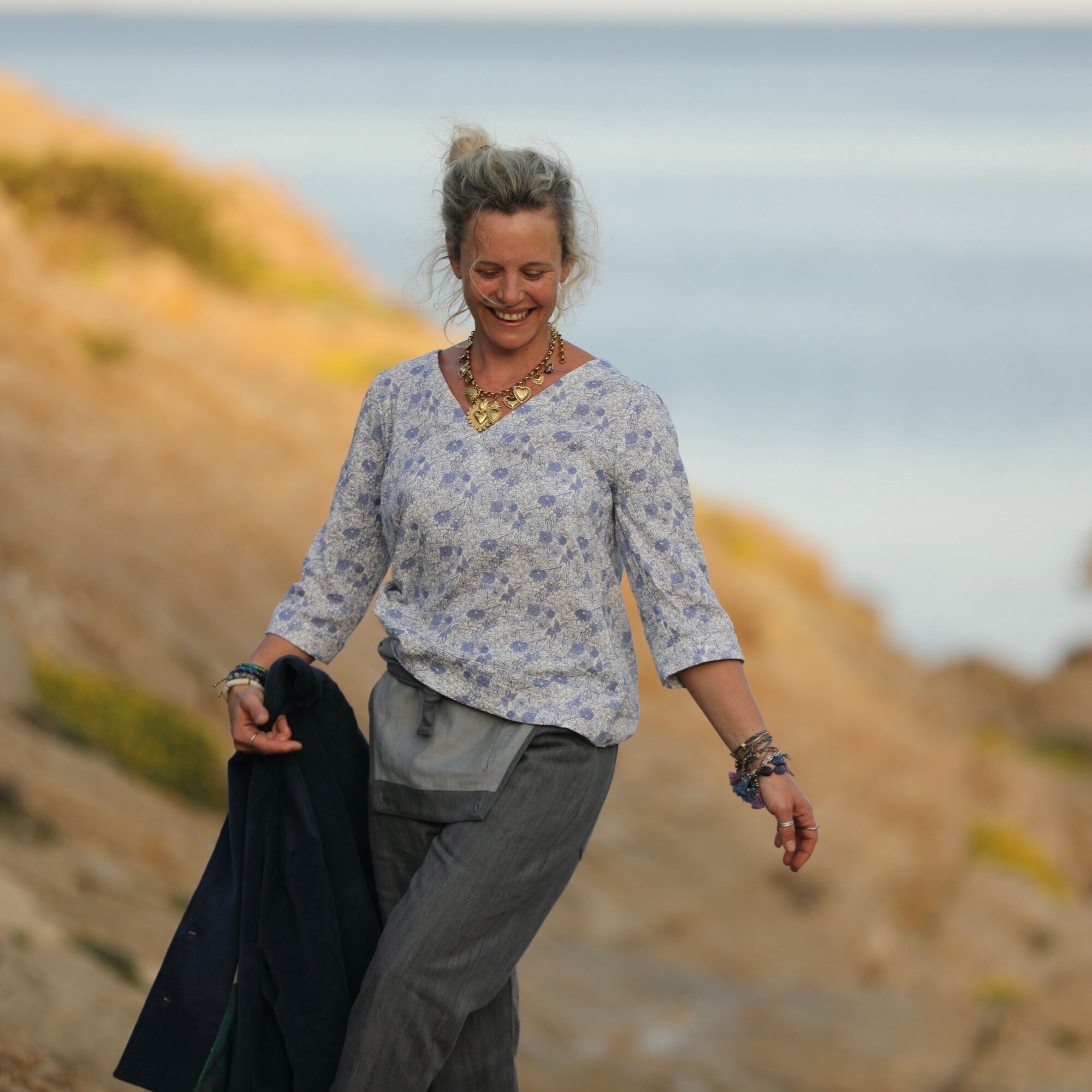 Eulalie est un haut élégant à manches 3/4, doté d’un col V structuré grâce à une enforme. Ses manches légèrement bouffantes, rehaussées de fronces, apportent une touche de raffinement tout en offrant un confort optimal aux bras.