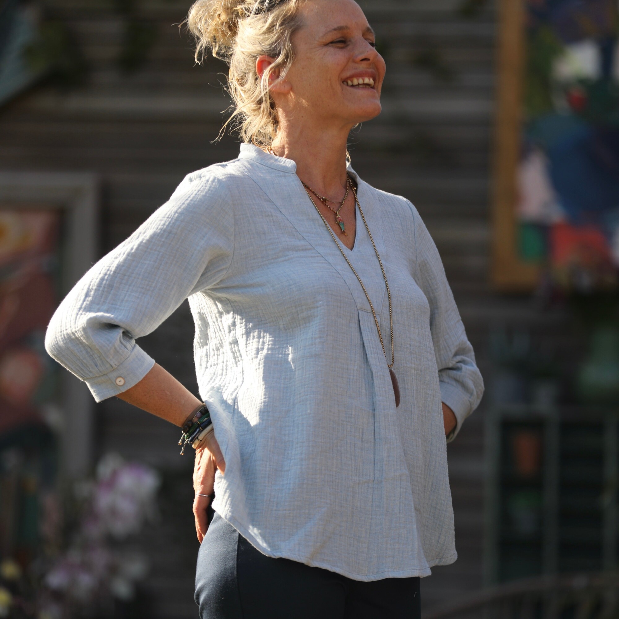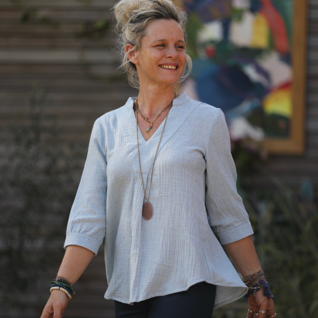Isabeau, la blouse fluide et légère, parfaite pour la belle saison :-) Grâce à ses plis généreux à l’avant et au dos, elle offre une belle ampleur et un volume aérien. Son décolleté en V façon vareuse lui apporte une touche casual-chic, faisant d’elle une pièce facile à porter au quotidien.