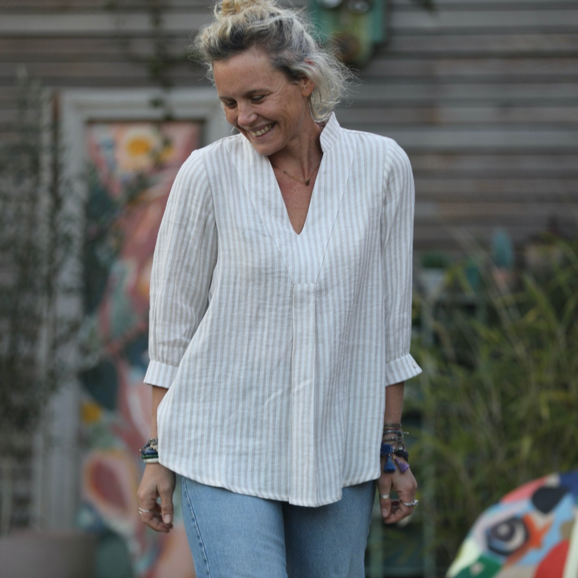 Isabeau, la blouse fluide et légère, parfaite pour la belle saison :-) Grâce à ses plis généreux à l’avant et au dos, elle offre une belle ampleur et un volume aérien. Son décolleté en V façon vareuse lui apporte une touche casual-chic, faisant d’elle une pièce facile à porter au quotidien.