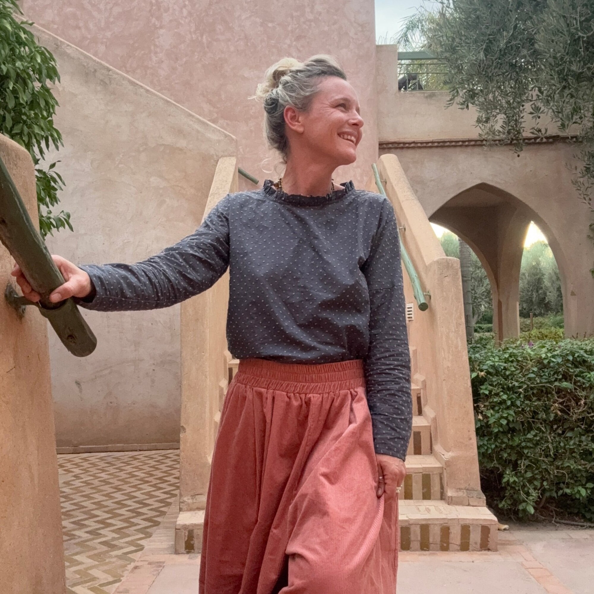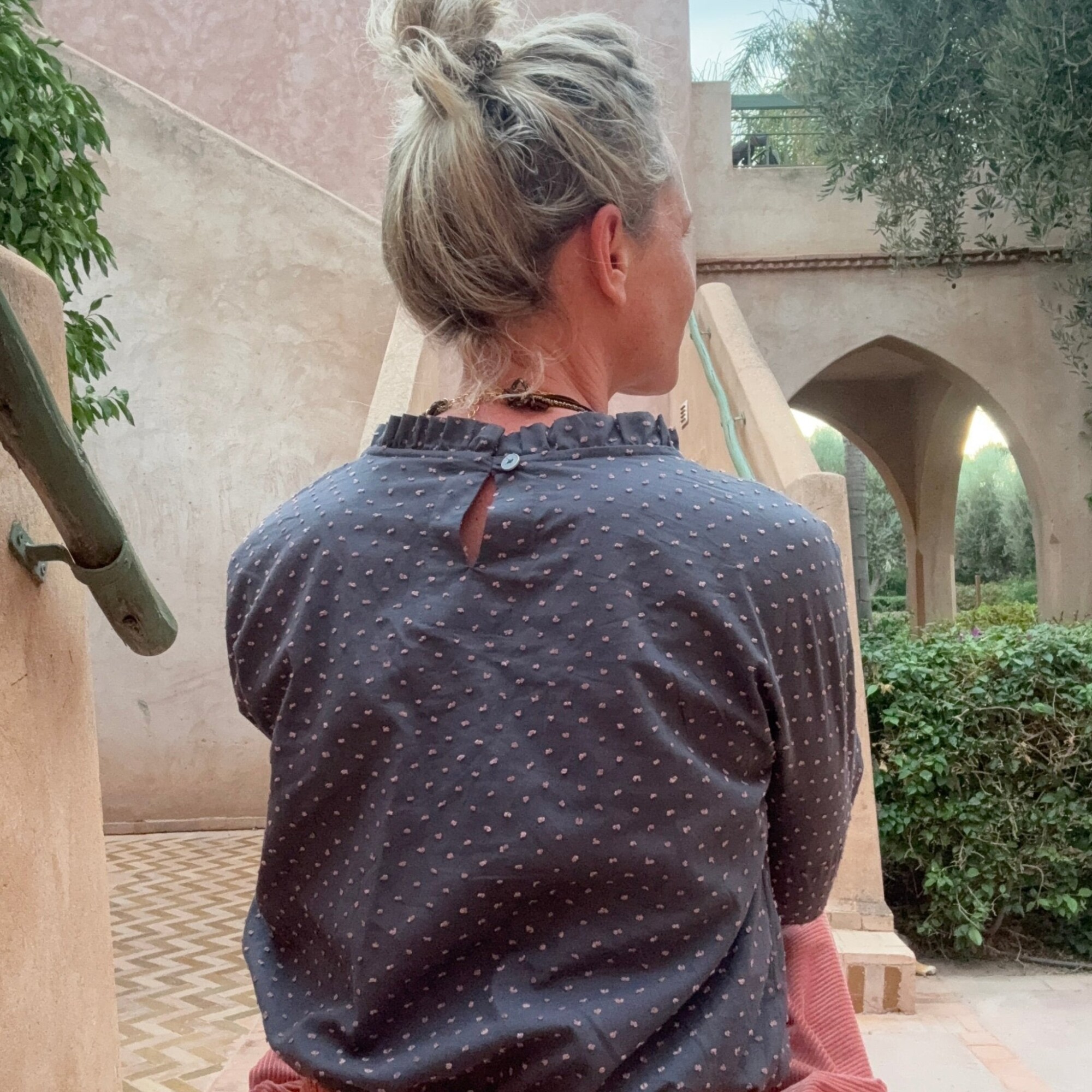 La blouse Janelle charme par sa délicatesse et sa coupe fluide, idéale pour le quotidien comme pour les moments plus habillés. Son col froufrou souligne le visage avec féminité, tandis que la goutte boutonnée dans le dos — fermée par un bouton nacré serti de paillettes — ajoute une touche lumineuse et raffinée.