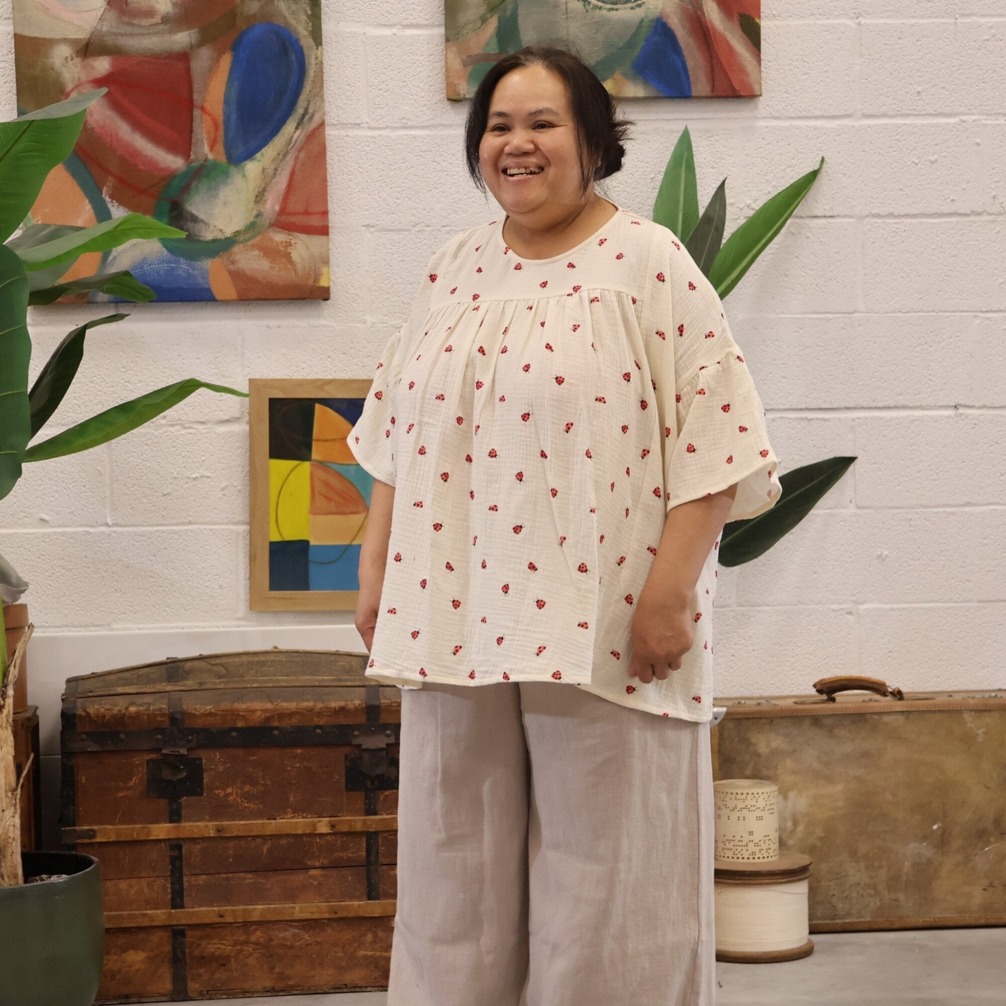 Léopoldine est une blouse élégante et structurée au volume généreux. Elle se distingue par son col rond chic, ses manches papillonnantes, ainsi que ses découpes et fronces au-dessus de la poitrine, offrant une allure à la fois casual et subtilement japonisante.