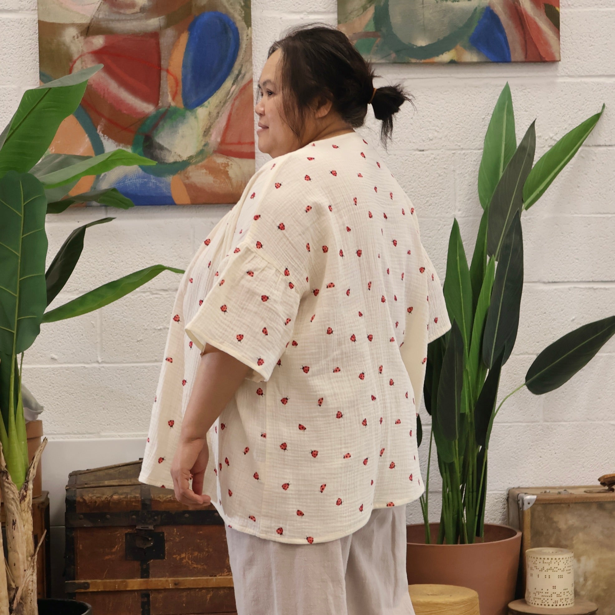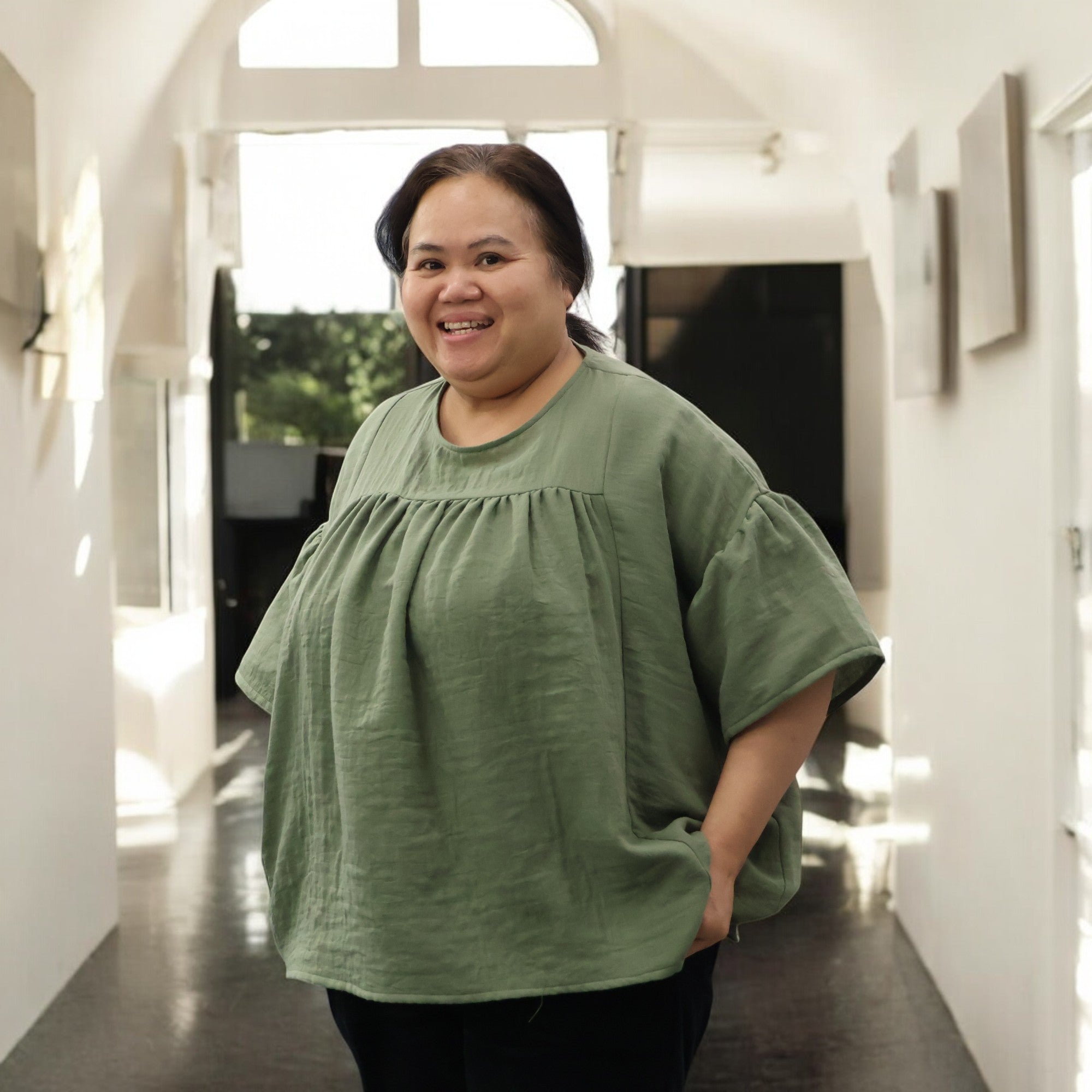 Léopoldine est une blouse élégante et structurée au volume généreux. Elle se distingue par son col rond chic, ses manches papillonnantes, ainsi que ses découpes et fronces au-dessus de la poitrine, offrant une allure à la fois casual et subtilement japonisante.
