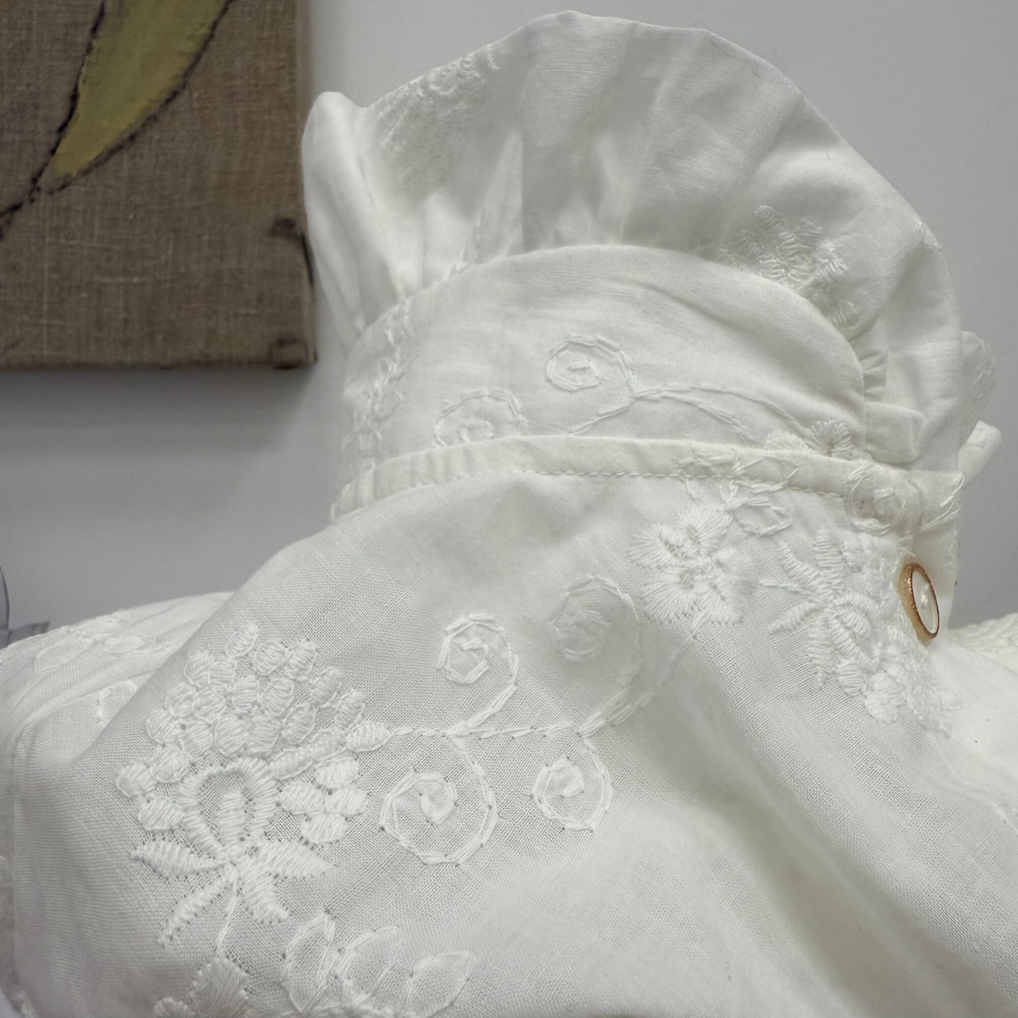 Voici la ravissante Marthe petite soeur de Myrtille, pleine d'élégance avec son col à froufrous, rehaussé d'un centimètre cette année, et son décolleté modulable. Ses manches longues se terminent par des poignets boutonnés.