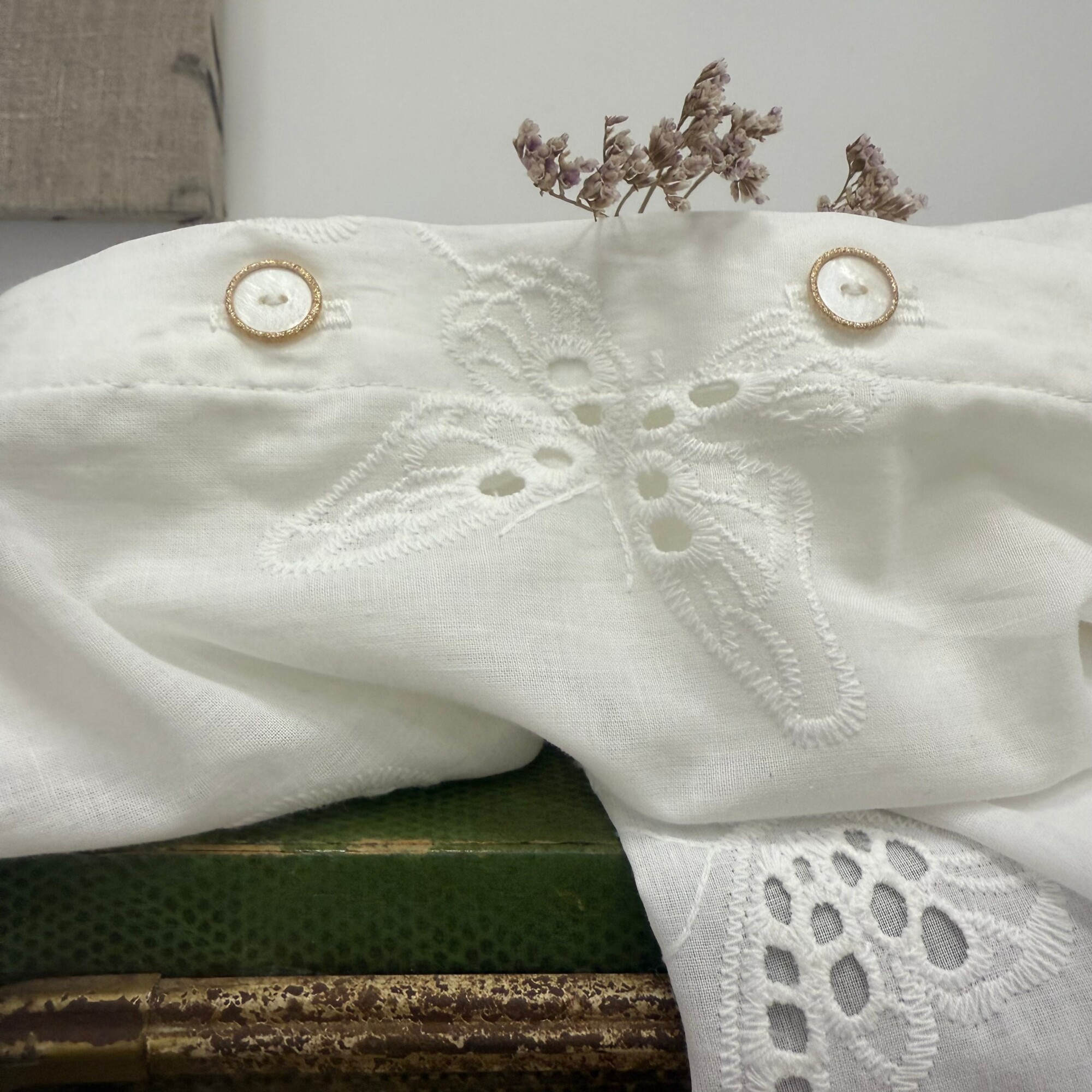 Voici la ravissante Marthe petite soeur de Myrtille, pleine d'élégance avec son col à froufrous, rehaussé d'un centimètre cette année, et son décolleté modulable. Ses manches longues se terminent par des poignets boutonnés.