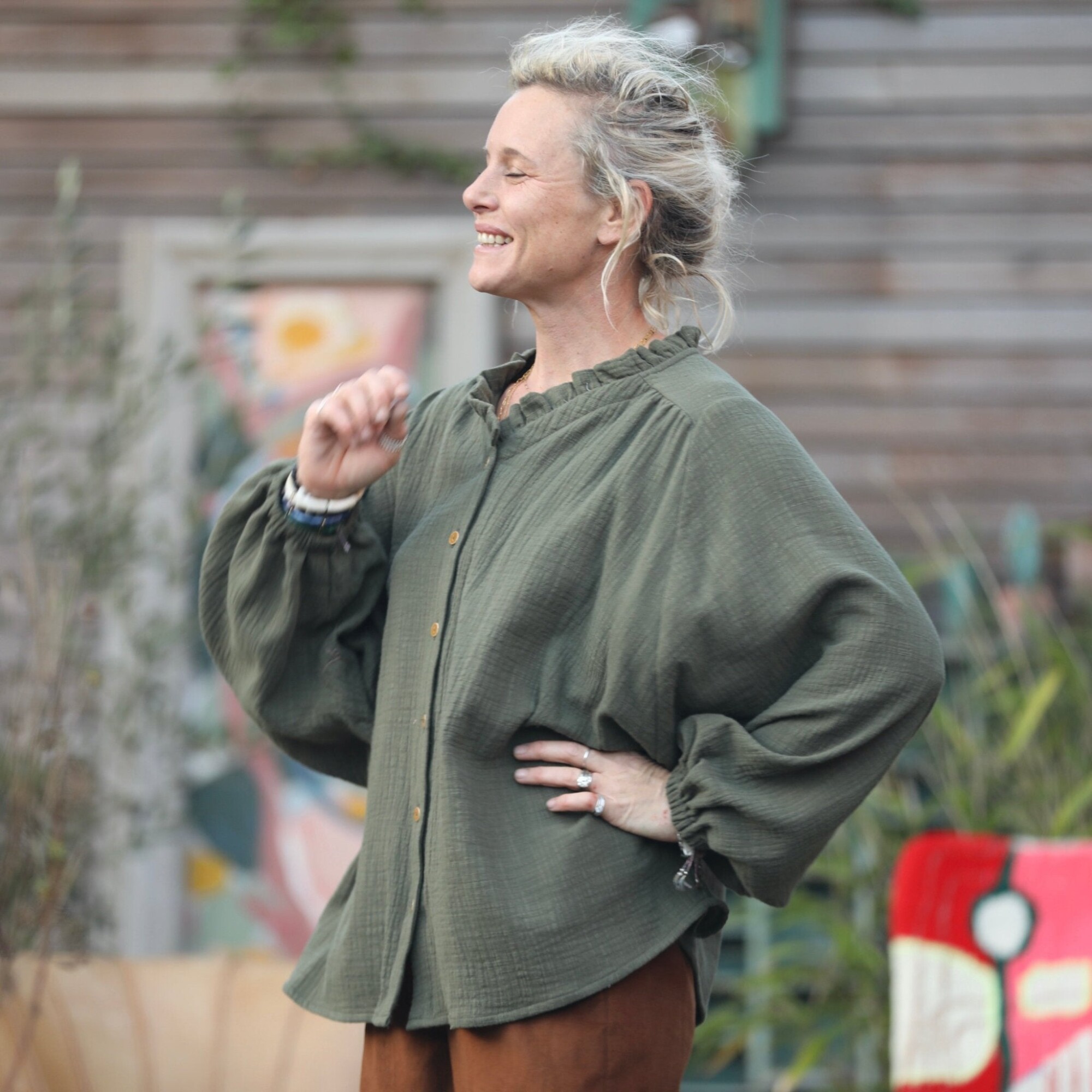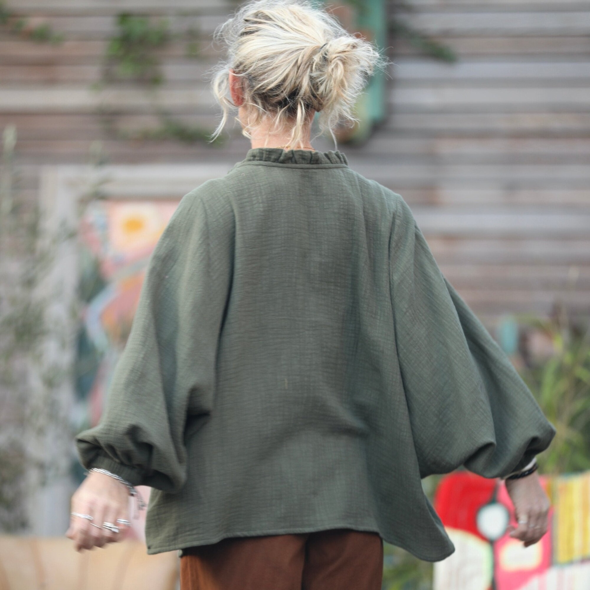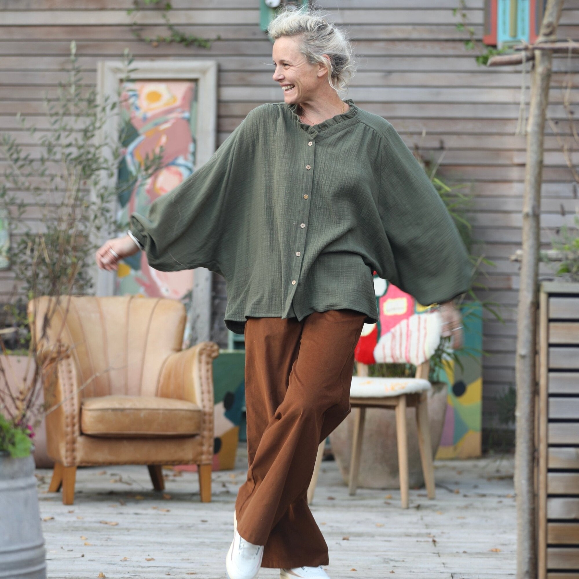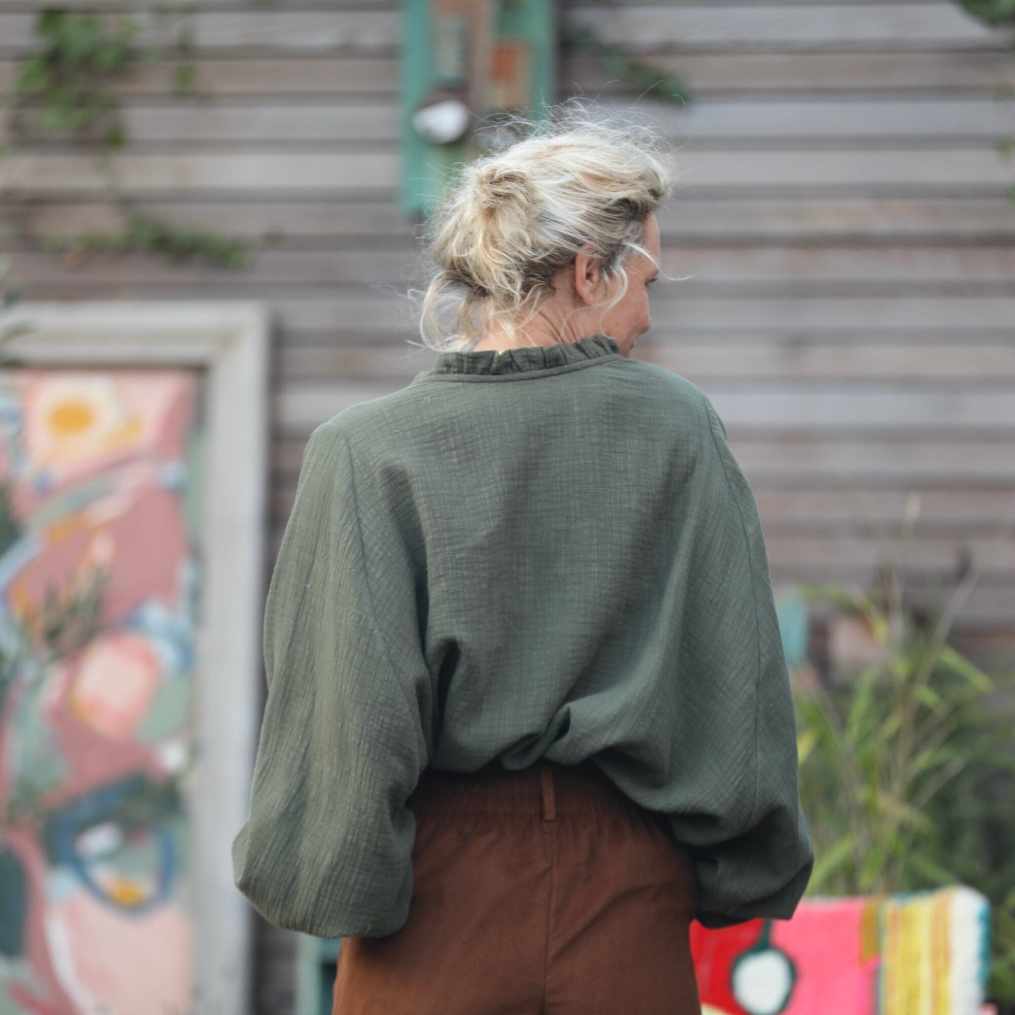 Voici la charmante Miléna, alliant élégance et confort avec sa coupe ample, son emmanchure kimono et son col à froufrous subtilement accompagné d'un décolleté discret. Ses manches longues se terminent par des poignets ajustés grâce à un élastique.
