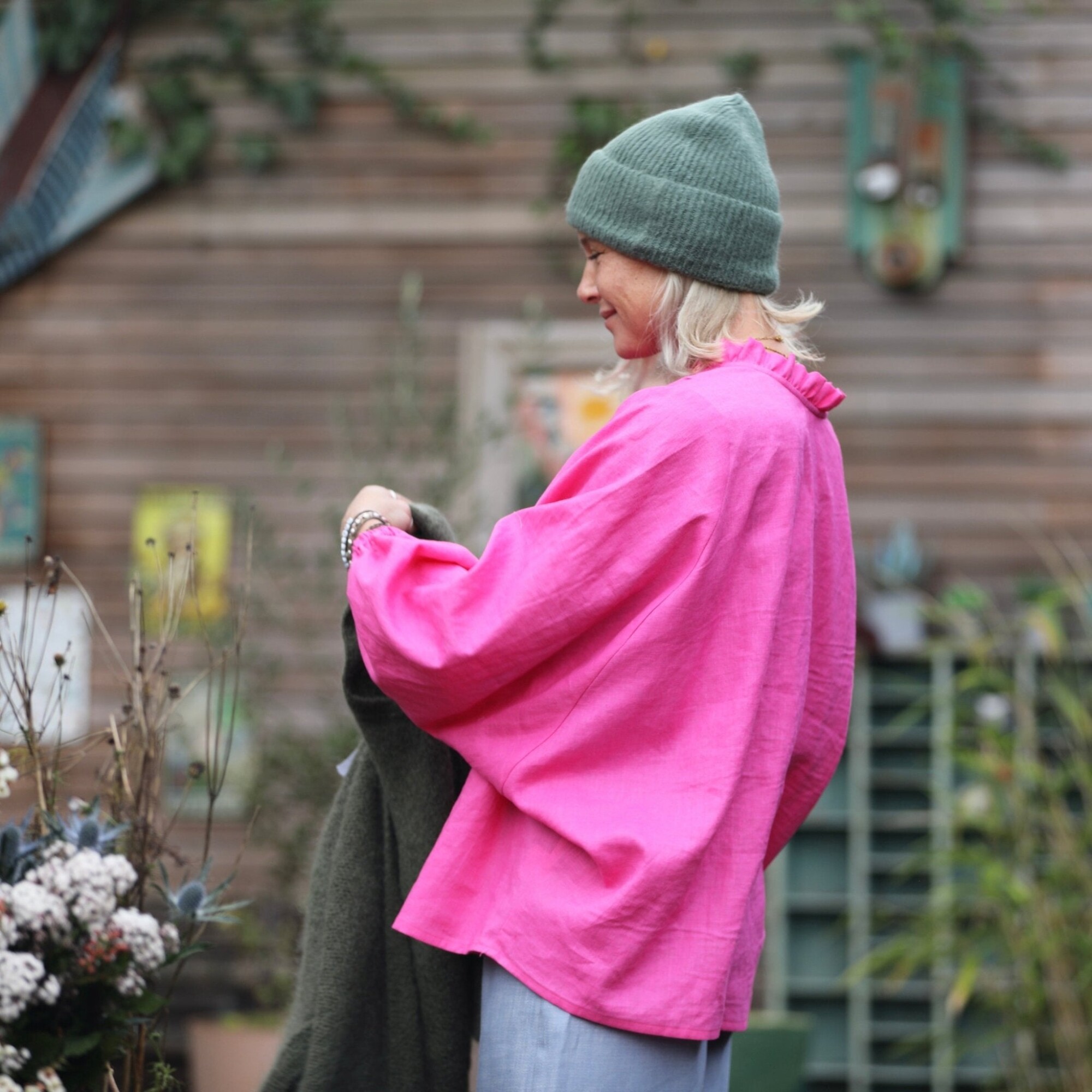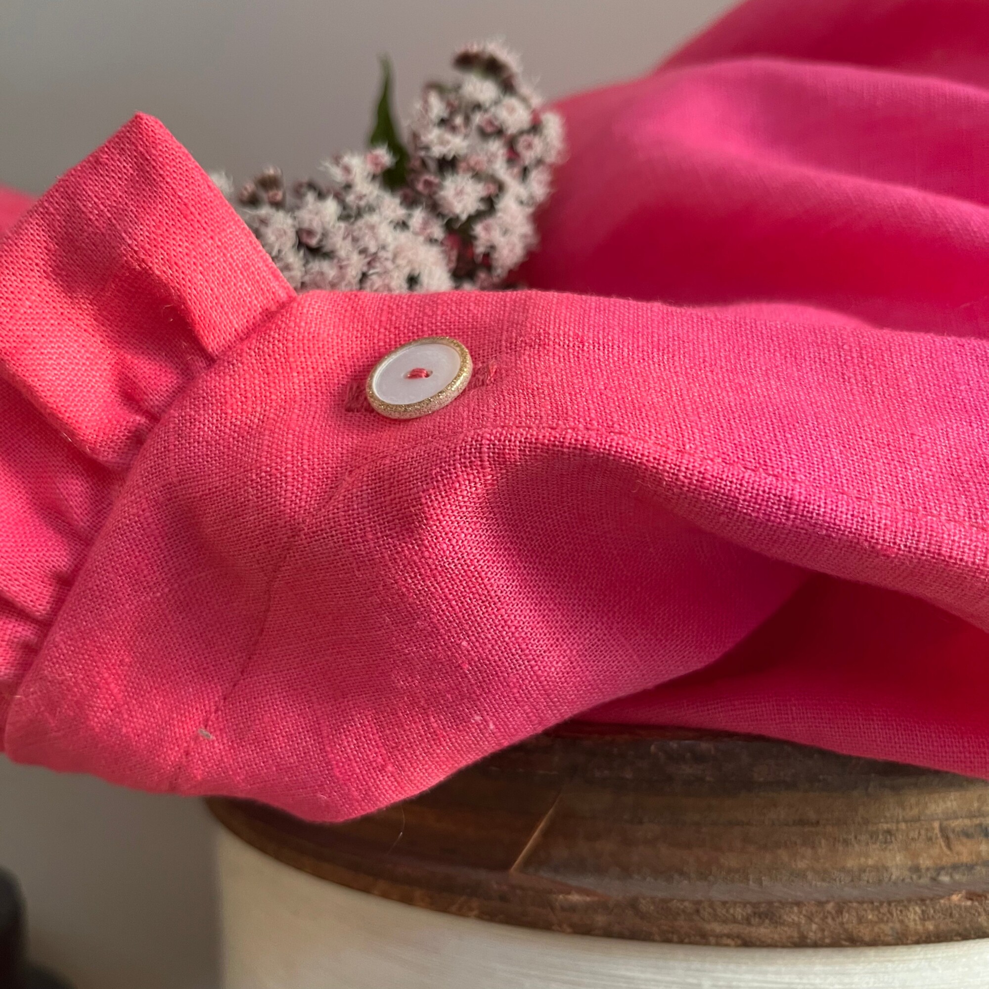 Voici la charmante Miléna, alliant élégance et confort avec sa coupe ample, son emmanchure kimono et son col à froufrous subtilement accompagné d'un décolleté discret. Ses manches longues se terminent par des poignets ajustés grâce à un élastique.