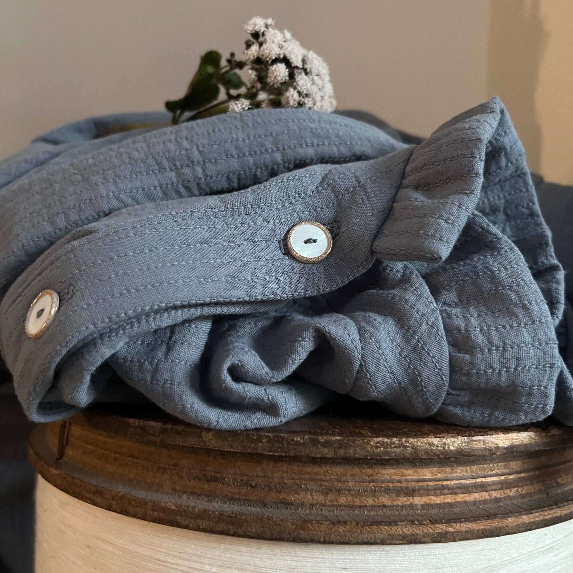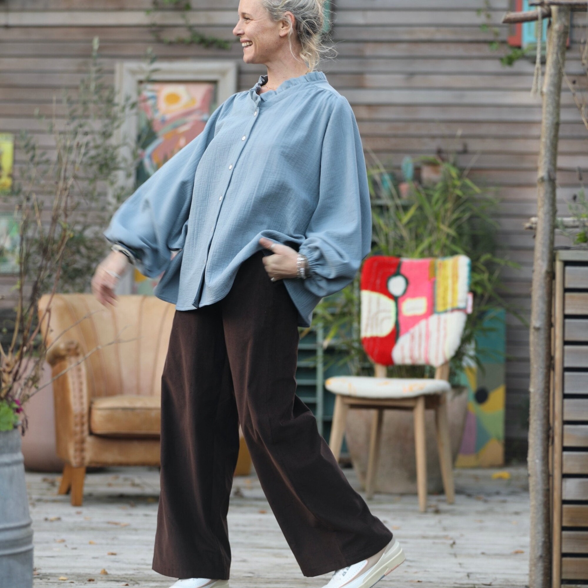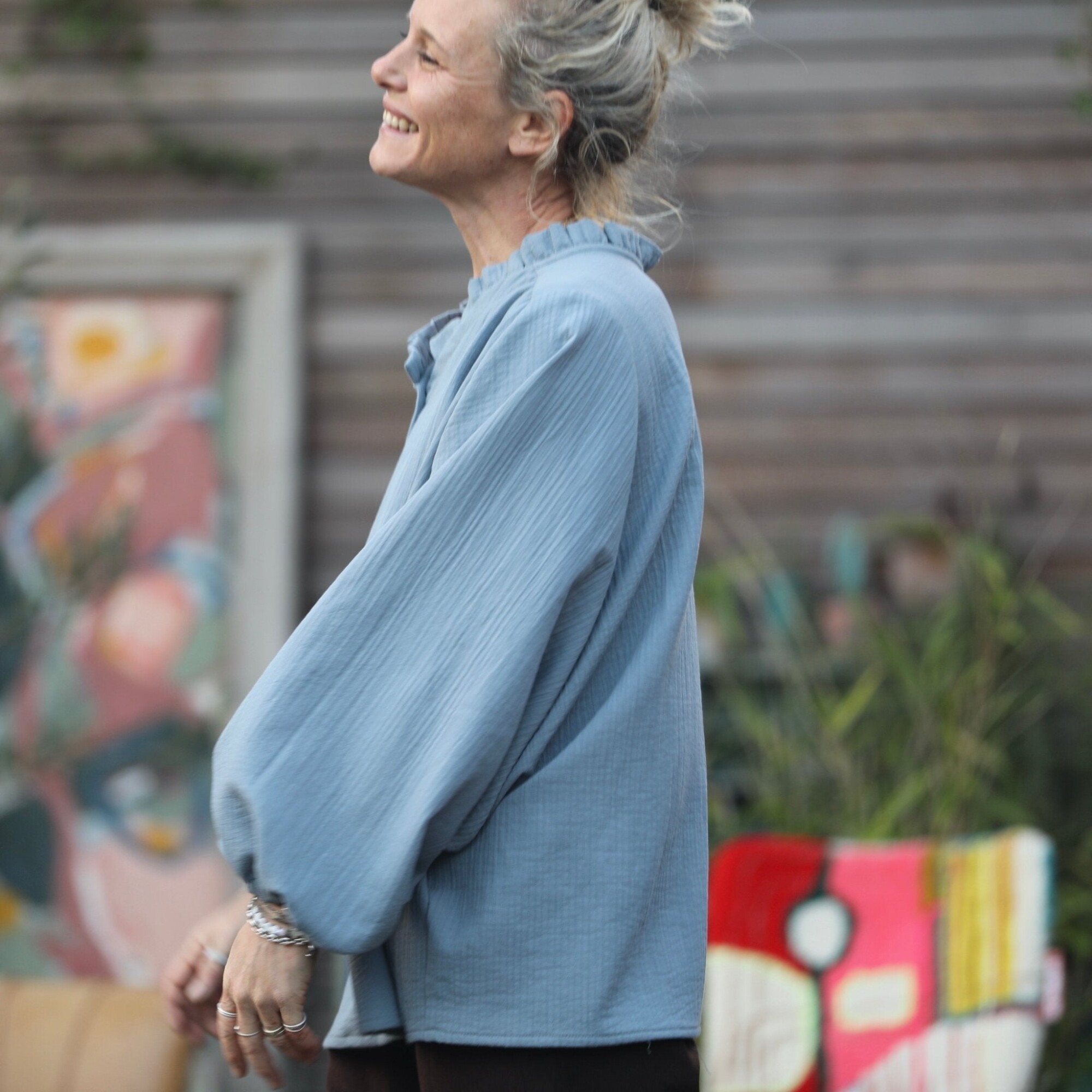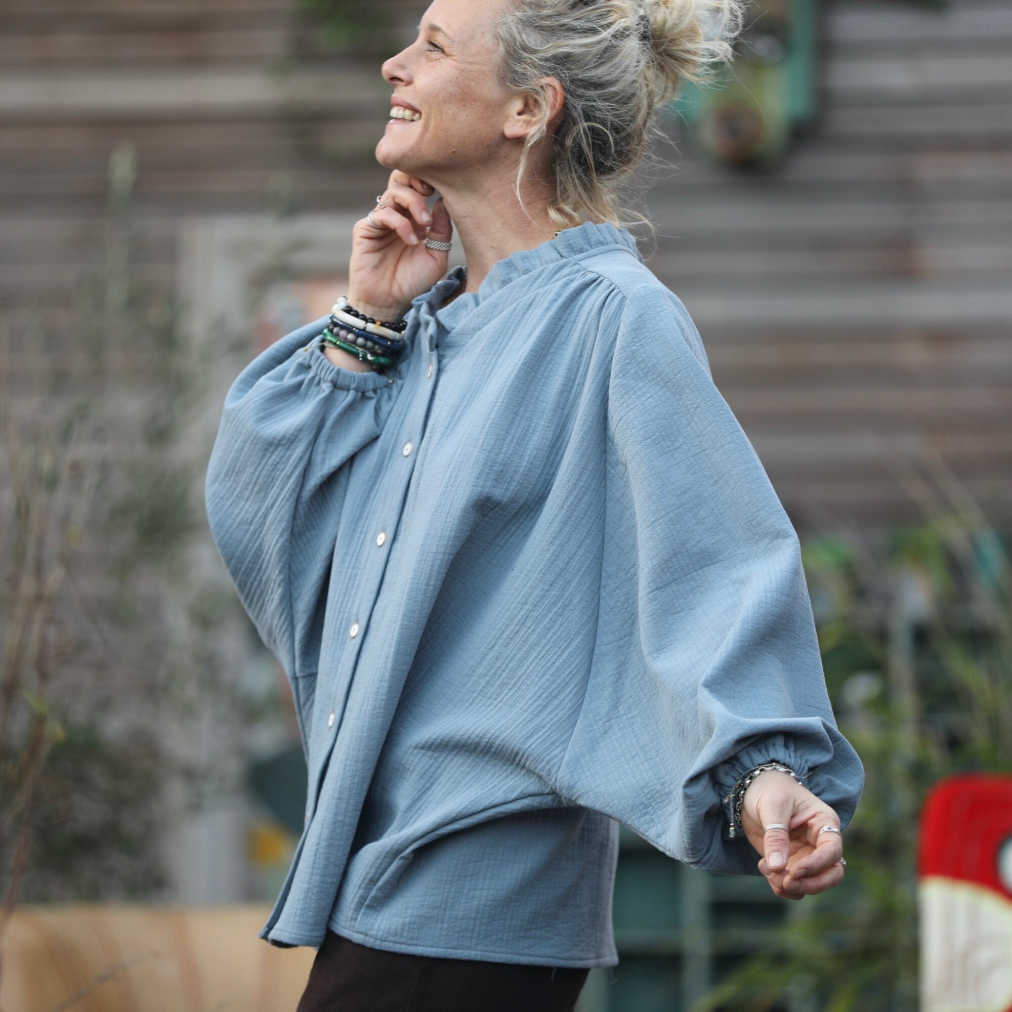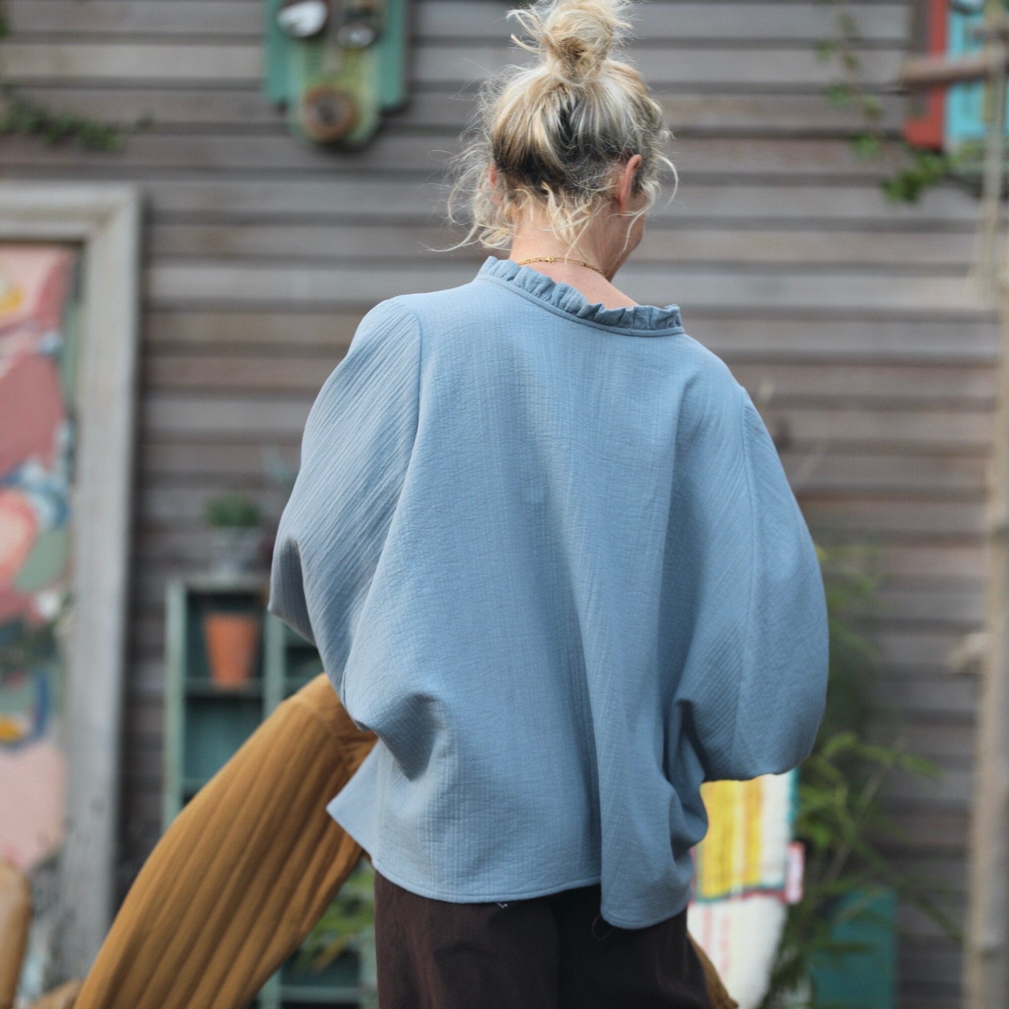 Voici la charmante Miléna, alliant élégance et confort avec sa coupe ample, son emmanchure kimono et son col à froufrous subtilement accompagné d'un décolleté discret. Ses manches longues se terminent par des poignets ajustés grâce à un élastique.