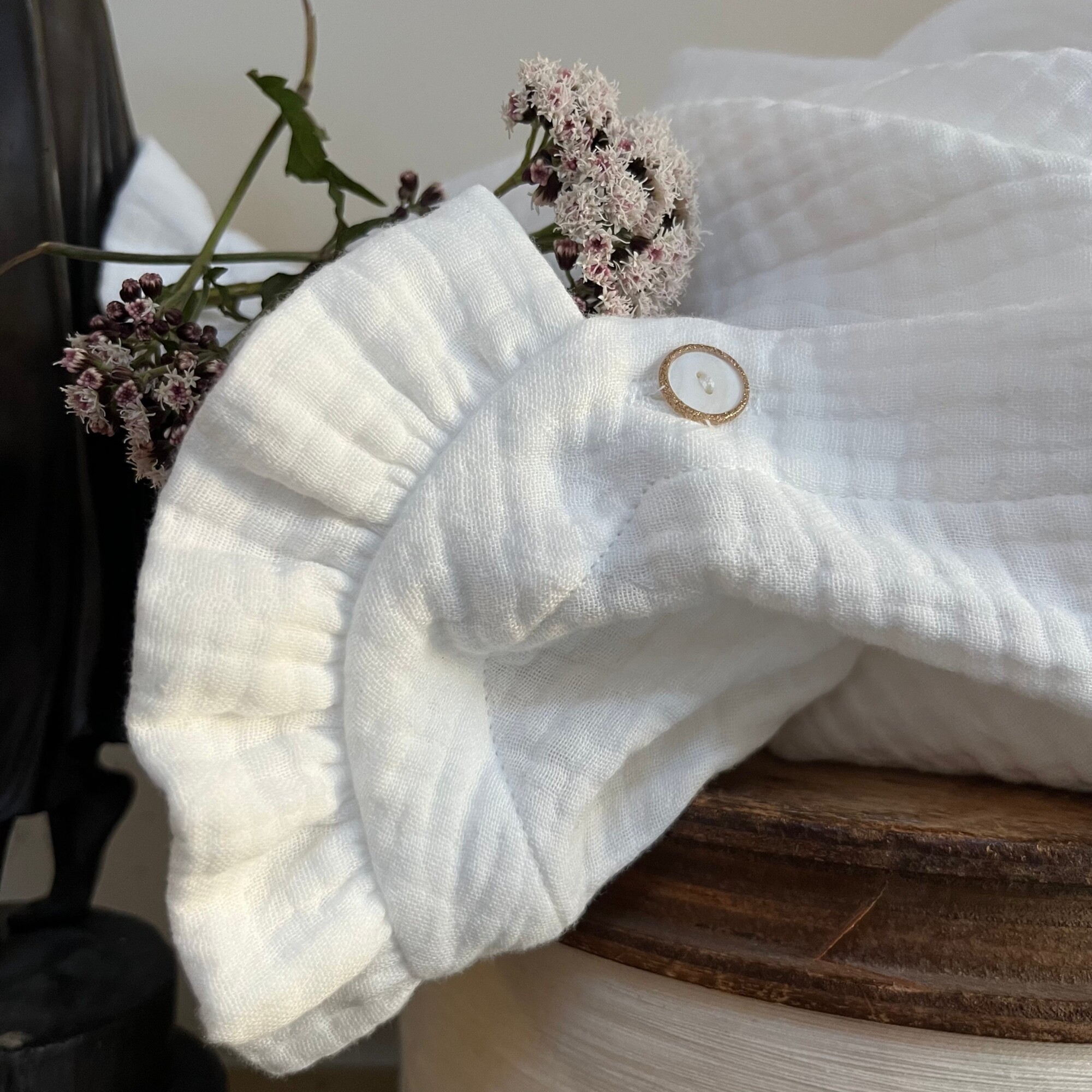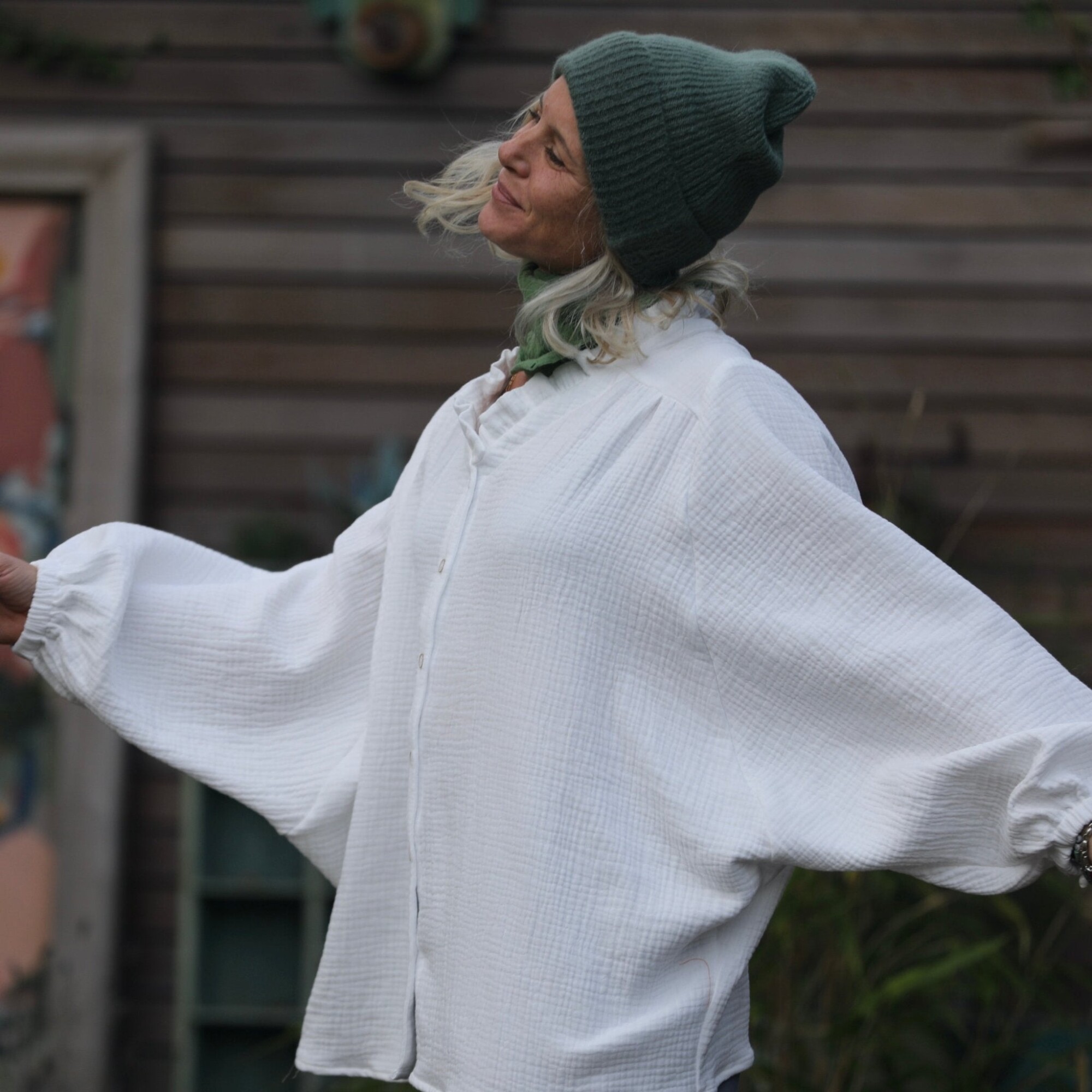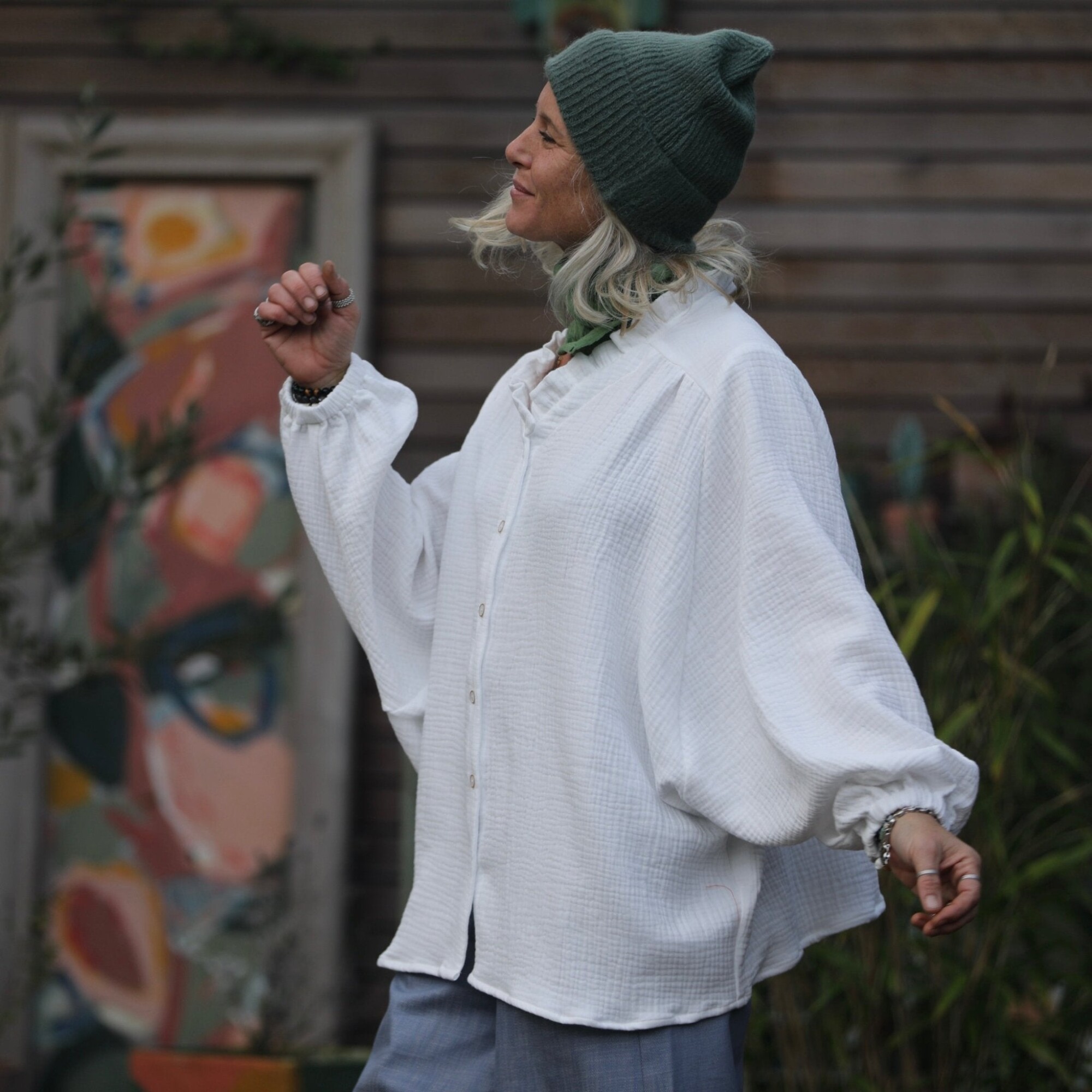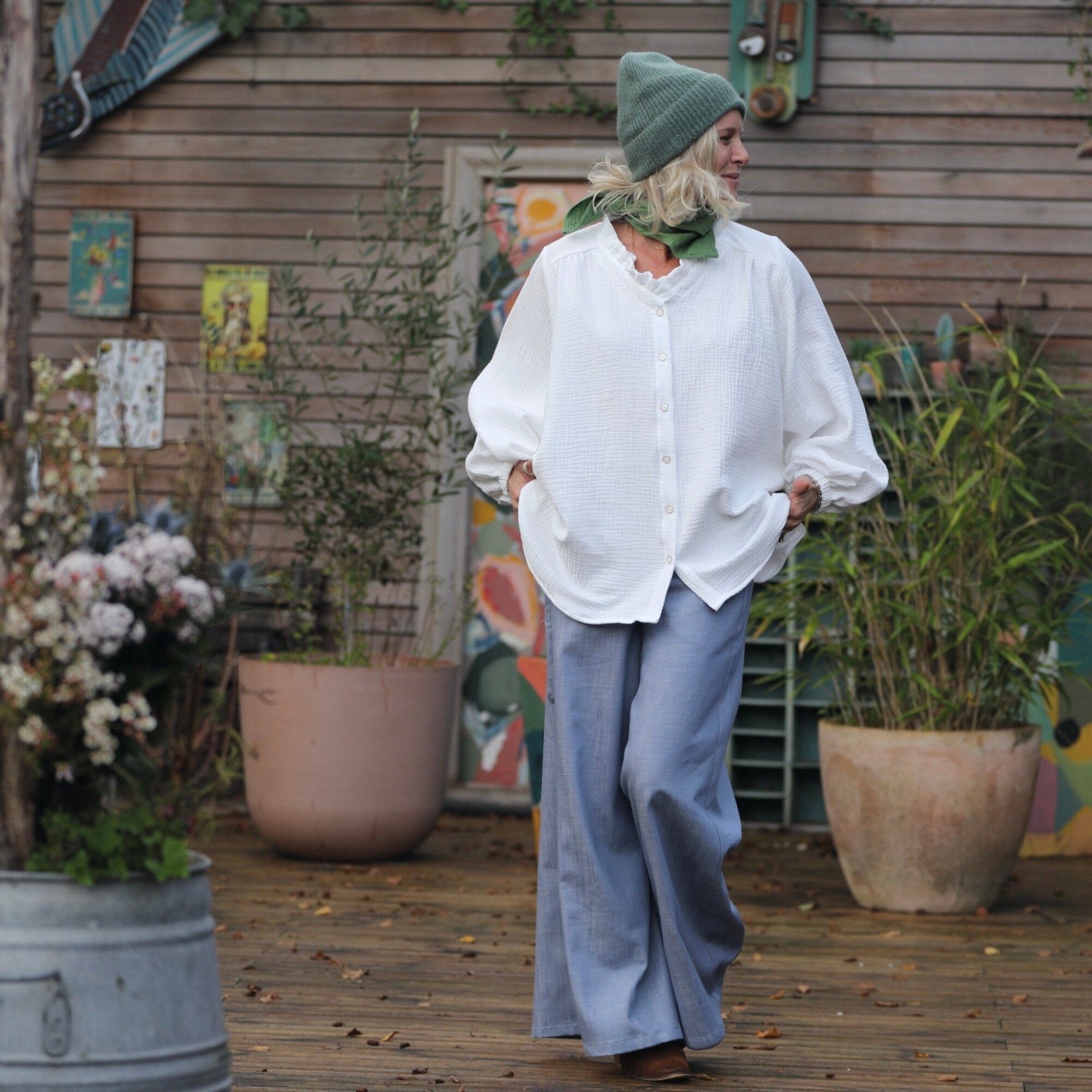 Voici la charmante Miléna, alliant élégance et confort avec sa coupe ample, son emmanchure kimono et son col à froufrous subtilement accompagné d'un décolleté discret. Ses manches longues se terminent par des poignets ajustés grâce à un élastique.
