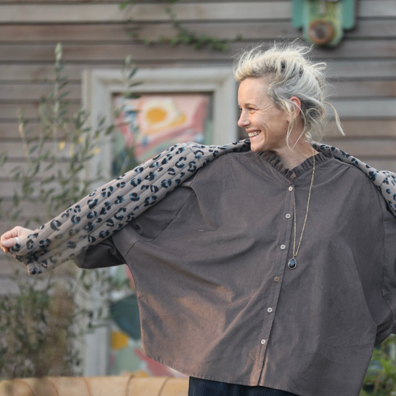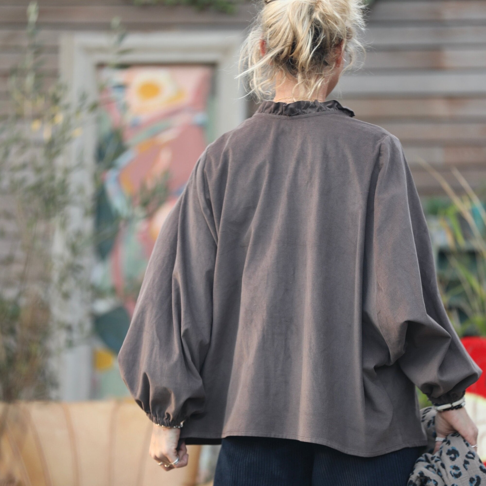 Voici la charmante Miléna, alliant élégance et confort avec sa coupe ample, son emmanchure kimono et son col à froufrous subtilement accompagné d'un décolleté discret. Ses manches longues se terminent par des poignets ajustés grâce à un élastique.