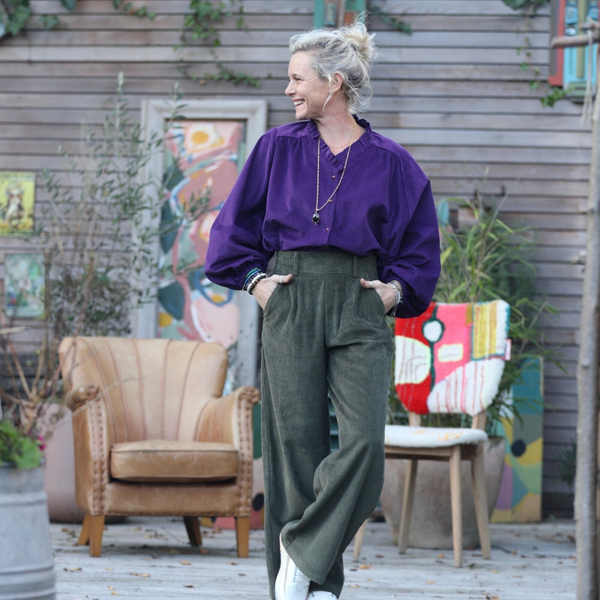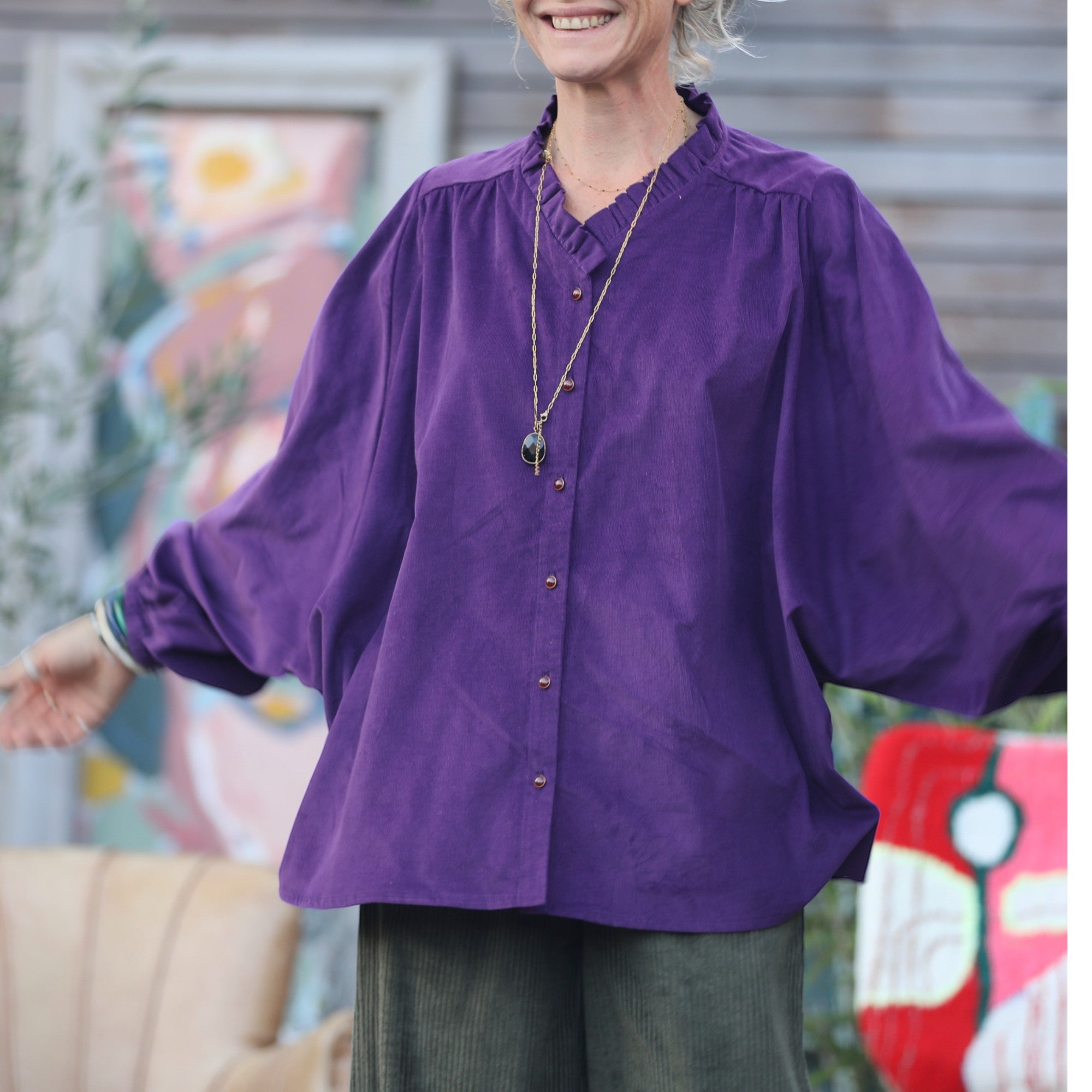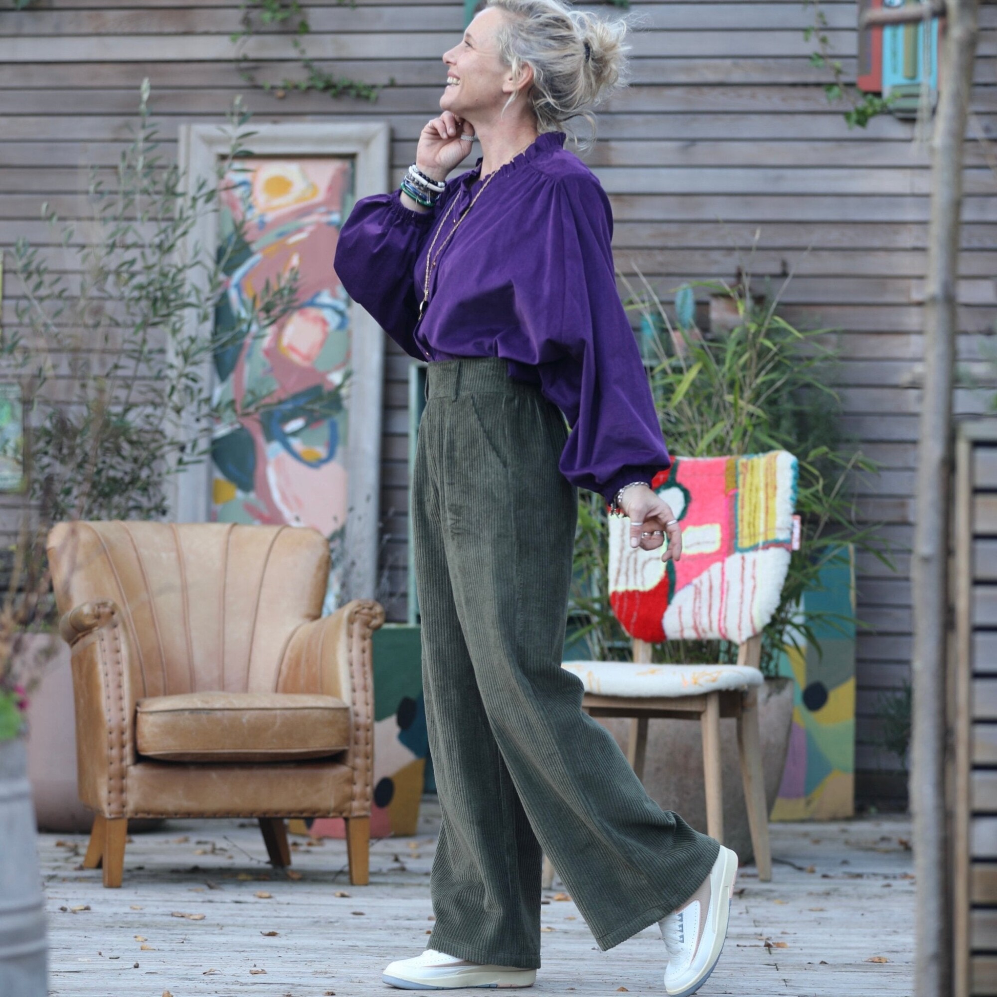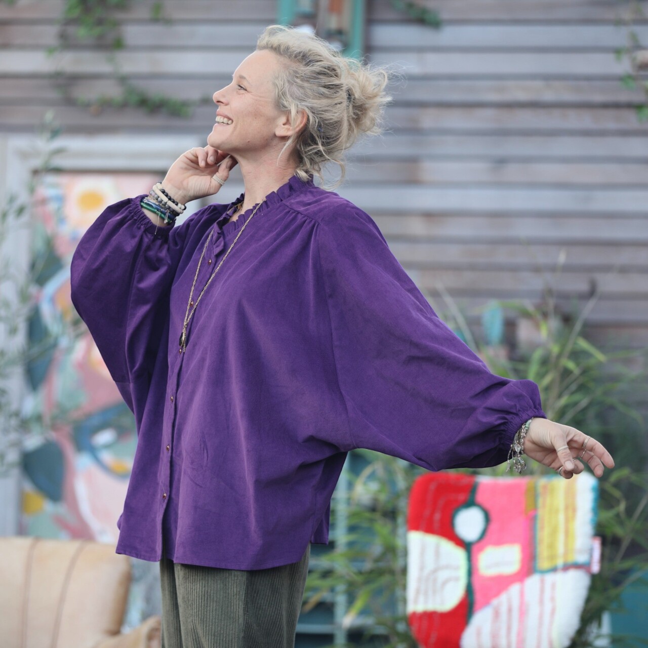 Voici la charmante Miléna, alliant élégance et confort avec sa coupe ample, son emmanchure kimono et son col à froufrous subtilement accompagné d'un décolleté discret. Ses manches longues se terminent par des poignets ajustés grâce à un élastique.
