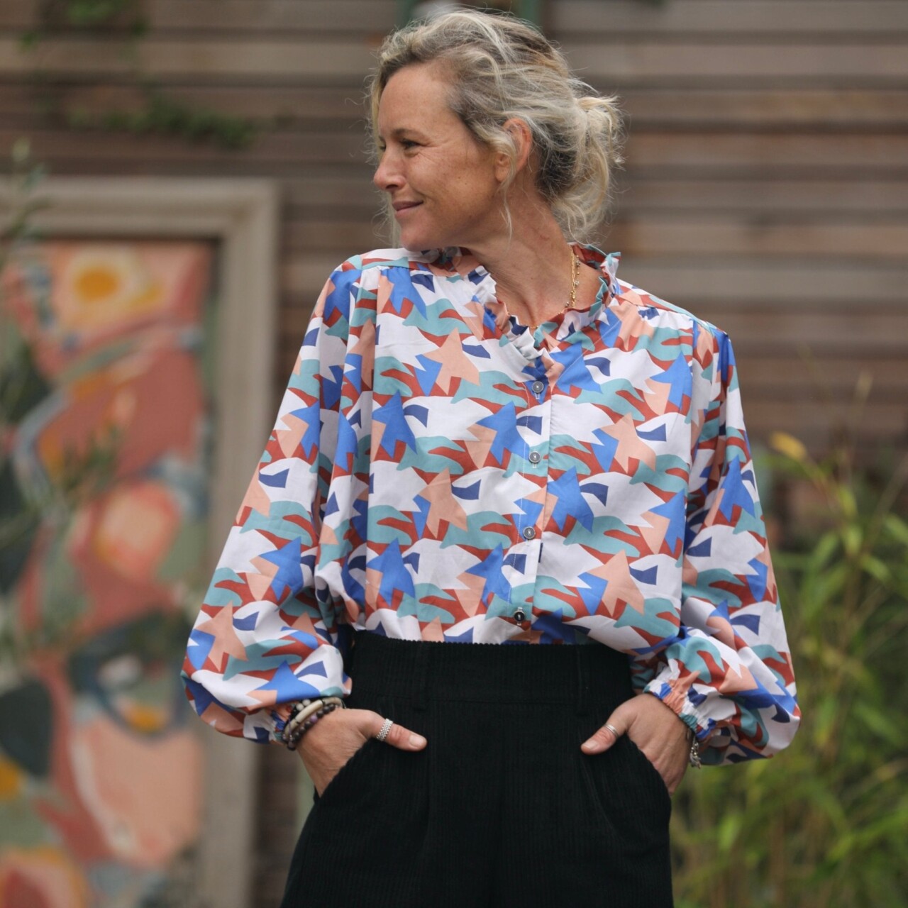 Voici la charmante Miléna, alliant élégance et confort avec sa coupe ample, son emmanchure kimono et son col à froufrous subtilement accompagné d'un décolleté discret. Ses manches longues se terminent par des poignets ajustés grâce à un élastique.