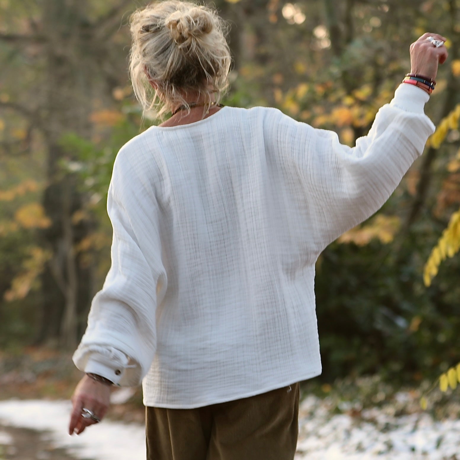 Coupe La Blouse Mina présente une coupe ample, aérienne et très confortable, parfaite pour un style naturel et élégant. Son col V structuré avec enforme apporte une touche raffinée, tandis que sa ligne vaporeuse enveloppe délicatement la silhouette.