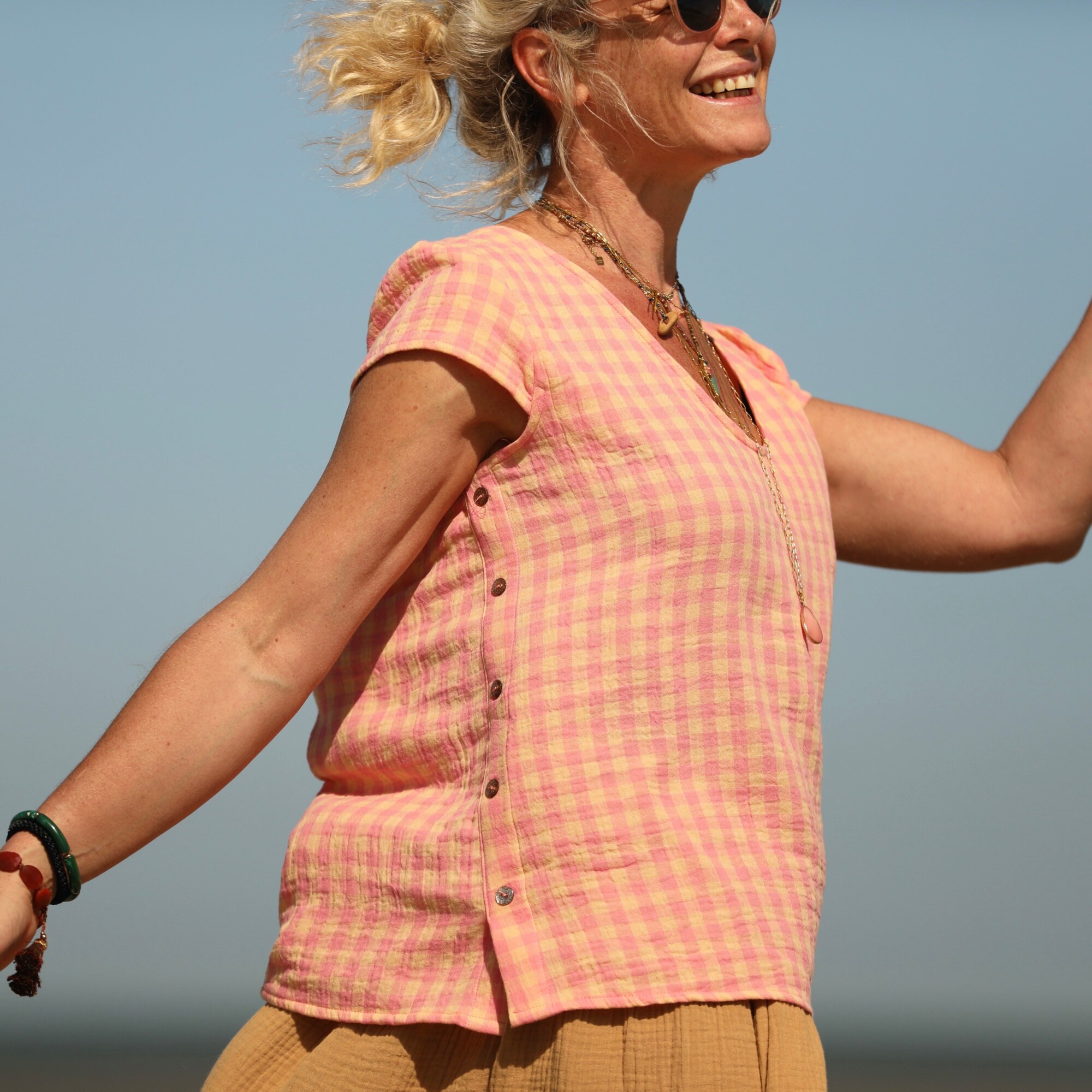 Blouse Sidonie double gaze de coton carreaux rose orangé
