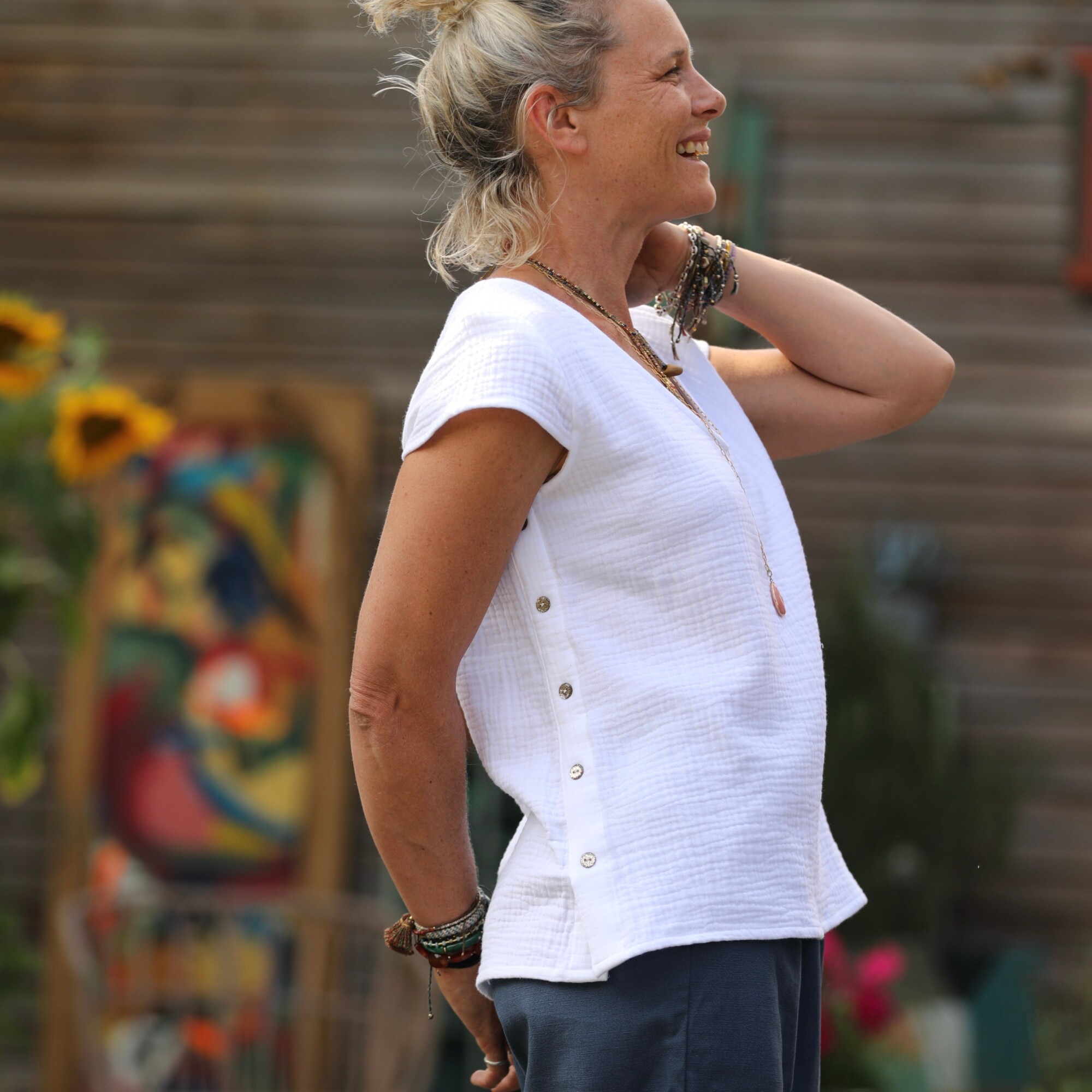 Une blouse en coton blanc à la fois pure, fluide et structurée Sidonie est l’alliée idéale des beaux jours : une blouse féminine à l’allure fluide et douce, facile à porter au quotidien. Sa coupe ample et légèrement évasée glisse sur la silhouette sans la contraindre.