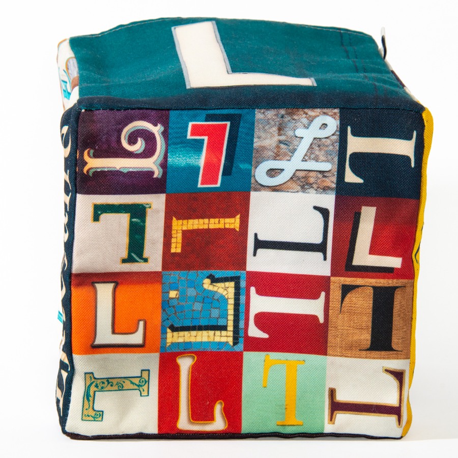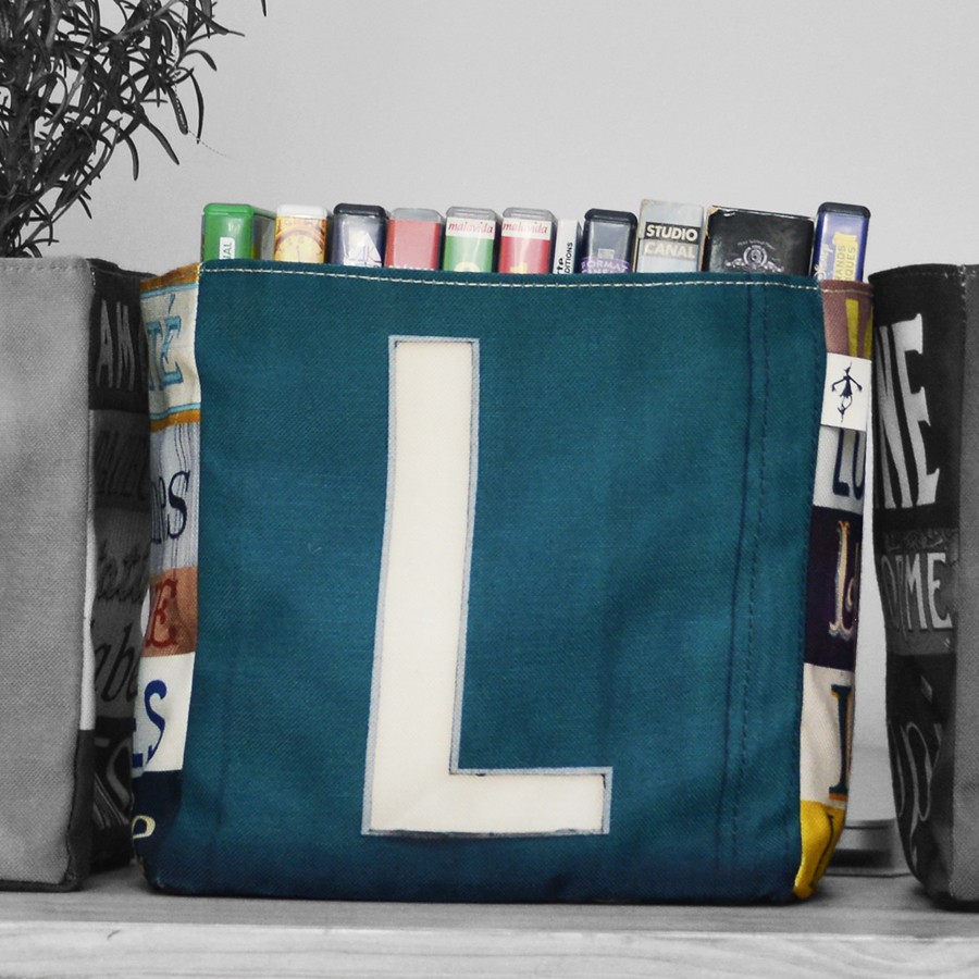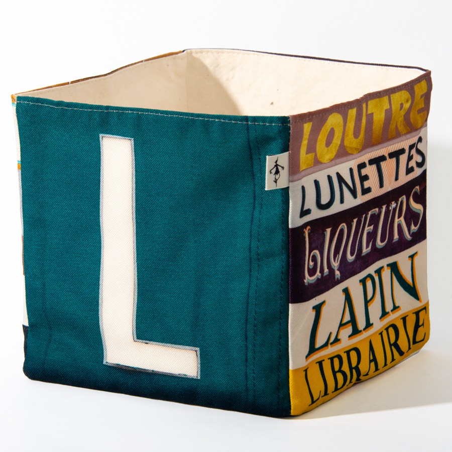 Dans la boite de rangement lettre L, le Lapin Littéraire et la Loutre à Lunettes Lapent des Liqueurs ! Composez vos messages avec ces boites en tissus alphabet.
