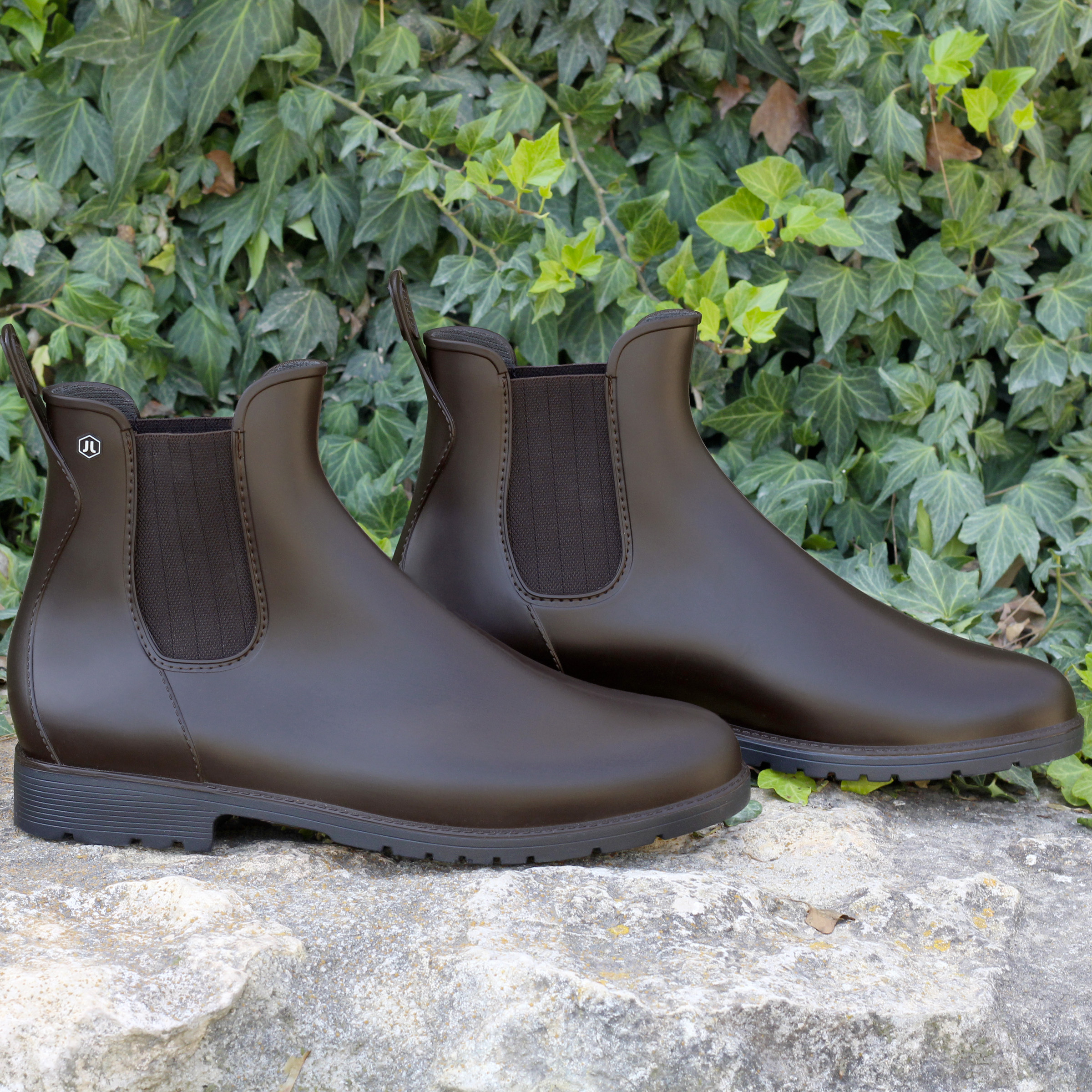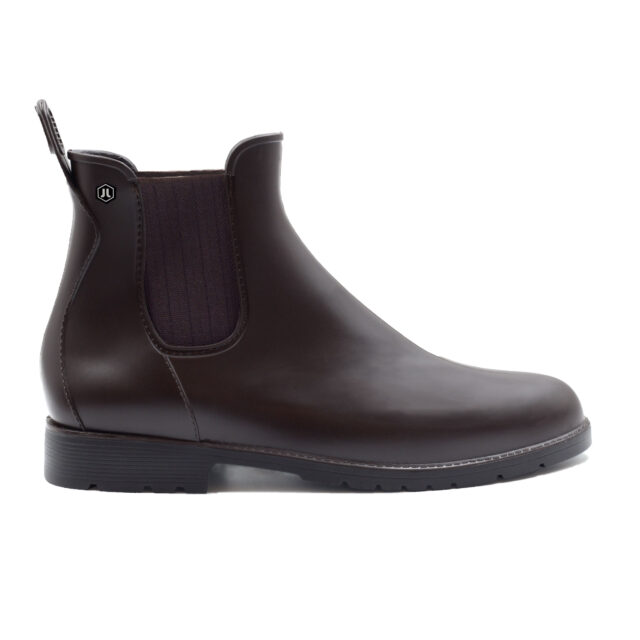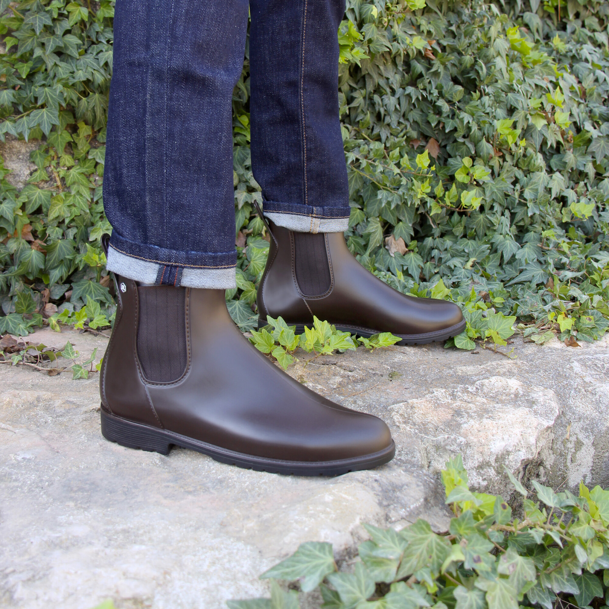 Boots de pluie homme en PVC recyclable marron, fabriquées en France. Aussi appelées bottines Chelsea imperméables ou wellies homme, ces boots de pluie au design Chelsea sont idéales pour affronter les intempéries avec élégance. PVC noir 100 % recyclable. Empiècements élastiques marron motif chevron. Doublure textile doux. Languette arrière pour un chaussage facile. Rivet hexagonal PVC. Semelle extérieure crantée PVC. Hauteur de la bottine depuis le talon : 14,5 cm. Hauteur du talon : 3 cm. 100 % fabriquées en France : piquage, montage et finition. PVC 100 % recyclable d'origine France. Emballage 100 % fabriqué au Portugal, certifié FSC et PEFC, réemployable et recyclable. Conforme aux normes REACH. Pour ce modèle, prenez votre pointure habituelle. Si vous êtes entre 2 pointures, prenez la pointure inférieure. Nettoyez à l'eau claire ou légèrement savonneuse, séchez à l'air libre.