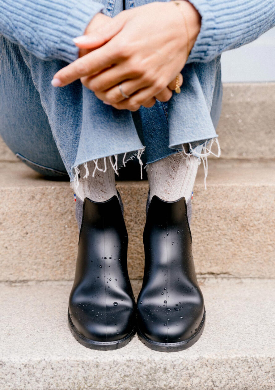Détails : Boots de pluie pour femme Boots complétement imperméables (hormis l'élastique) Languette arrière Empiècement élastiqué pour l'aération Doublure testée sans substances toxiques pour le corps et l'environnement 100% PVC recyclable Entièrement fabriquées en France, dans le Maine-et-Loire, elles répondent aux normes européennes environnementales les plus strictes en terme de pollution et du respect de l'environnement. Fabriquées à partir de PVC sans Phtalates Fabriquées en France Emballages et packagings éco-conçus Conseils d'entretien : En cas de tâches, frotter avec un chiffon humidifié d'eau savonneuse puis sécher.