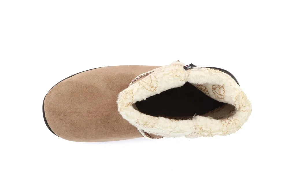 - Chaussons chauds : pantoufle montante avec dessus textile suédine "peau de pêche" marron et doublure textile polaire aspect moutonné (imprimé moutons beiges)