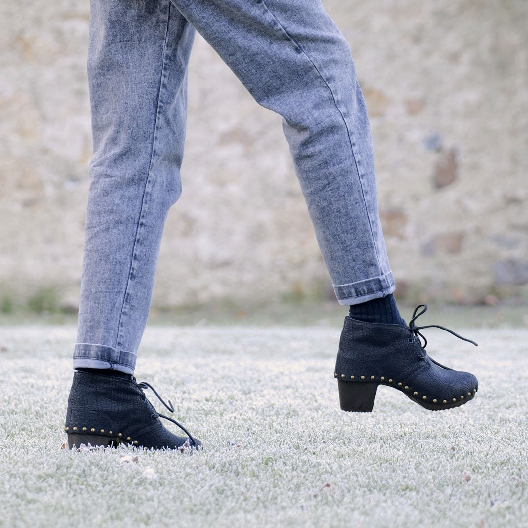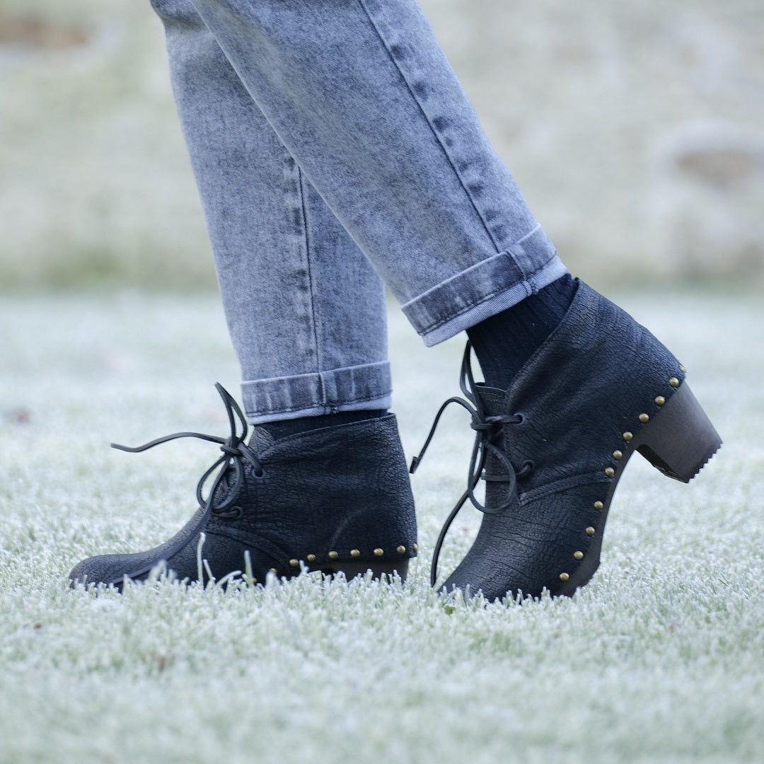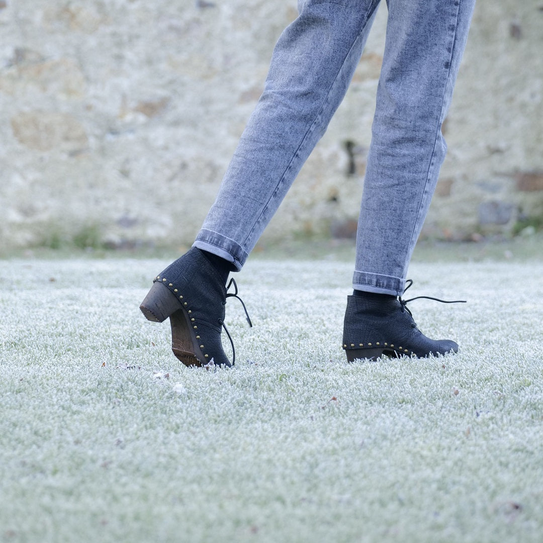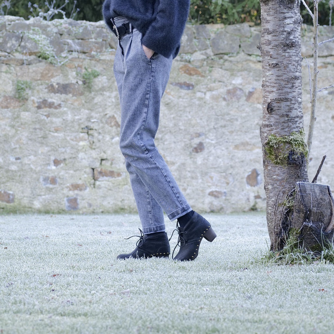 Élégante et intemporelle, notre bottine Oli se distingue par son cuir rustique noir à l’effet vintage, soigneusement travaillé pour offrir un rendu authentique et raffiné. Un modèle de caractère, pensé pour sublimer la silhouette tout en affirmant le savoir-faire artisanal français. Réalisée en cuir noir effet vintage, elle révèle des nuances naturelles et une patine subtile qui rendent chaque paire unique.