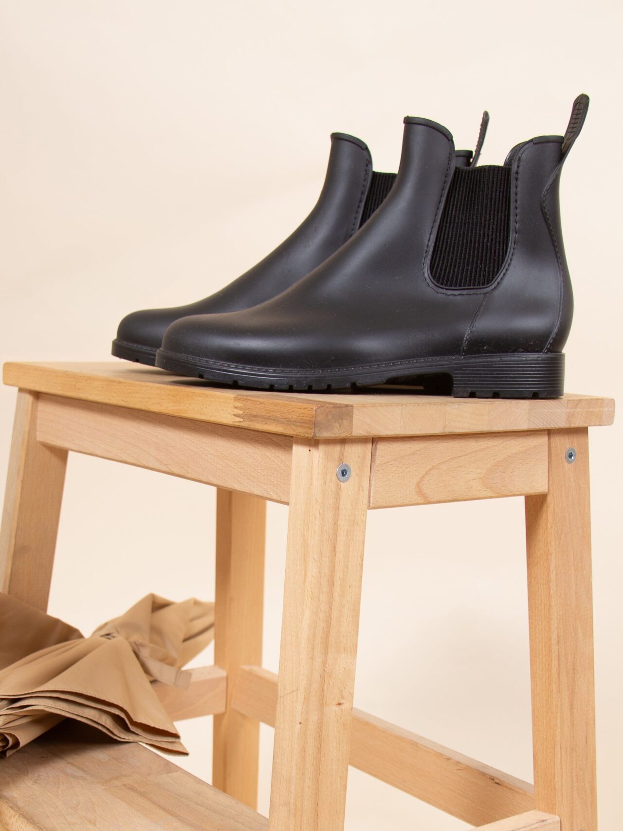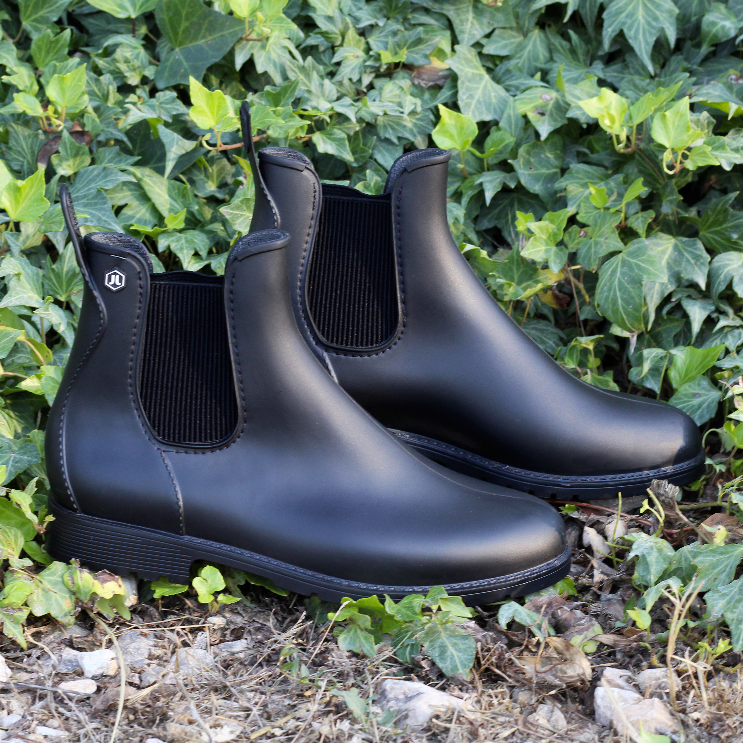 Bottines de pluie femme en PVC recyclable noir, fabriquées en France. Aussi appelées bottes de pluie ou bottines Chelsea imperméables, ces bottines au design Chelsea sont résistantes, agréables à porter et faciles à enfiler sous la pluie. PVC noir 100 % recyclable. Empiècements élastique côtelé. Doublure textile doux. Languette arrière pour faciliter le chaussage. Rivet hexagonal PVC. Semelle extérieure à crampons PVC. Hauteur de la bottine depuis le talon : 13 cm. Hauteur du talon : 2,5 cm. 100 % fabriquées en France : piquage, montage et finition. PVC 100 % recyclable d'origine France. Emballage 100 % fabriqué au Portugal, certifié FSC et PEFC, réemployable et recyclable. Vegan. Conforme aux normes REACH. Pour ce modèle, prenez votre pointure habituelle. Si vous êtes entre 2 pointures, prenez la pointure inférieure. Nettoyez à l'eau claire ou légèrement savonneuse, séchez à l'air libre.