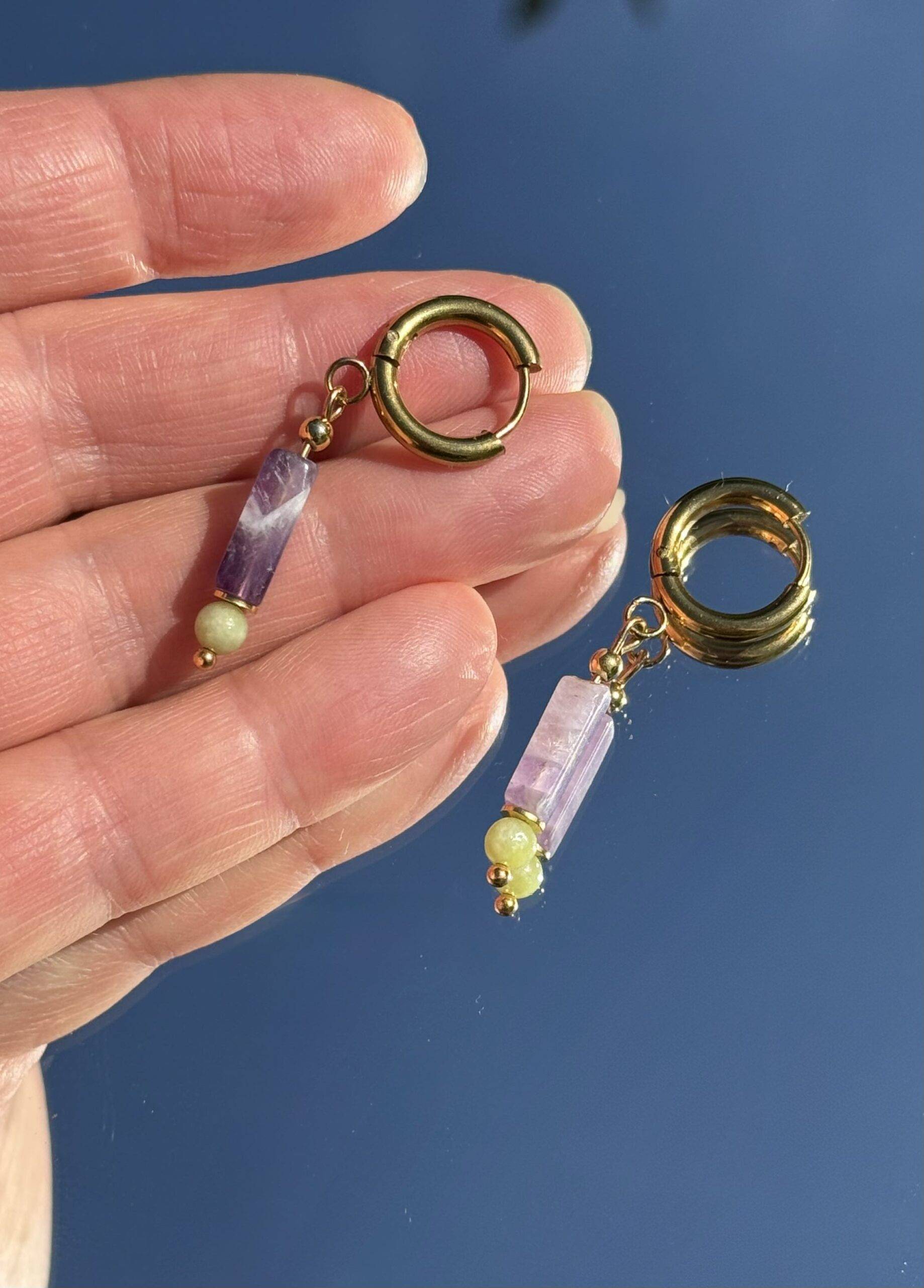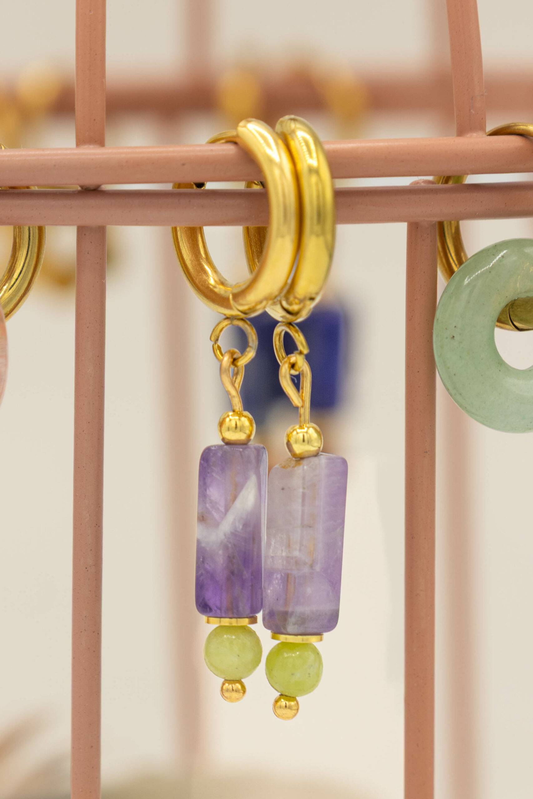 Les couleurs lumineuses de l'améthyste et du jade associés On aime ces jolies boucles d'oreilles aux couleurs douces. Ici, le vert clair du jade légèrement transparent s'associe parfaitement au violet de l'améthyste.