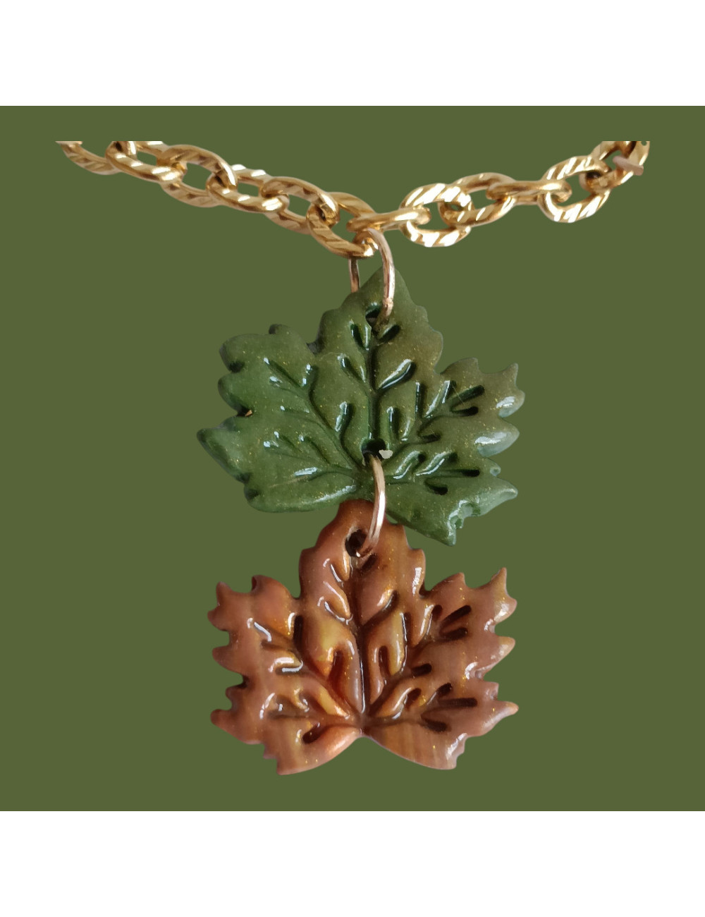 Objet principal : Sac noir avec une chaîne décorative.Décoration : Pendentifs en pâte polymère en forme de feuilles.Couleurs : Vert, brun, orange (thème automnal).Matériaux : Pâte polymère, métal (chaîne et anneaux). La photo montre un sac noir orné d'une chaîne décorative en or. Cette chaîne est agrémentée de pendentifs en forme de feuilles, réalisés en pâte polymère. Les feuilles présentent des couleurs automnales : des teintes de brun, de vert et d'orange, évoquant la saison d'automne. La chaîne est attachée aux anneaux métalliques situés sur les côtés du sac.